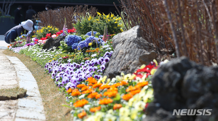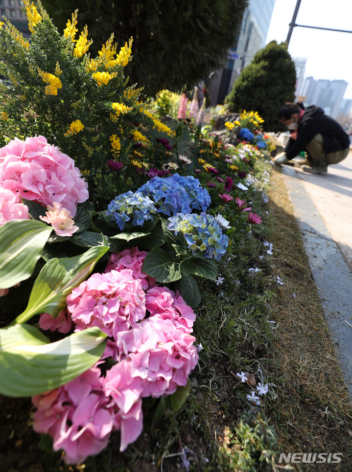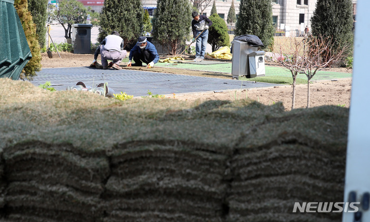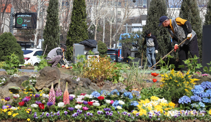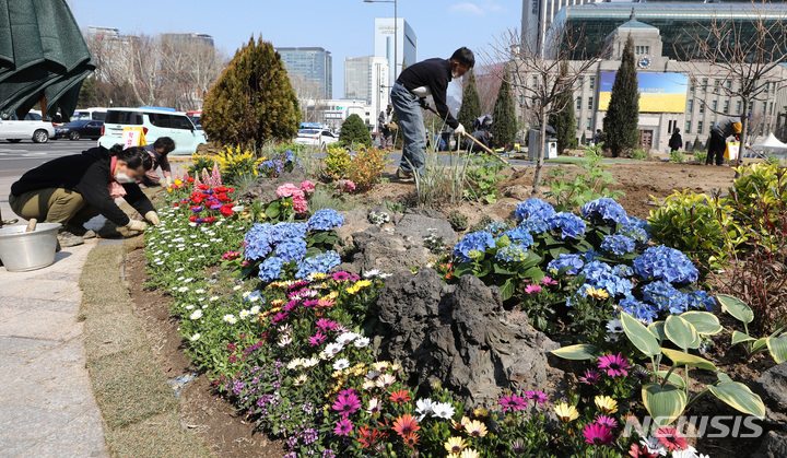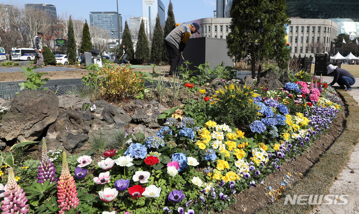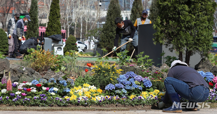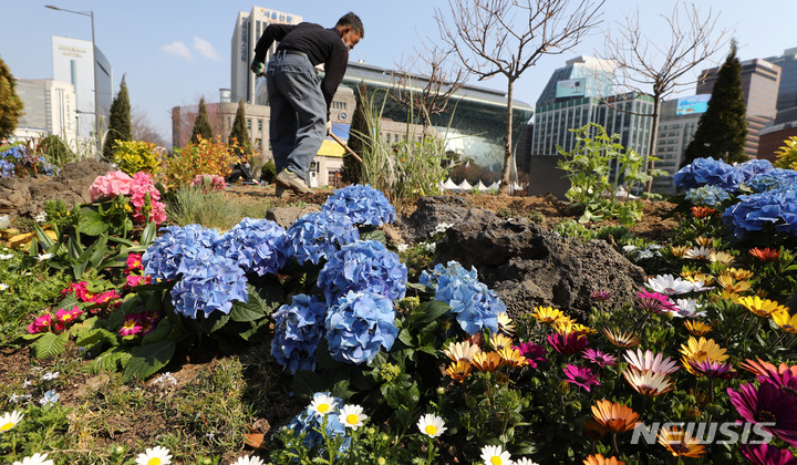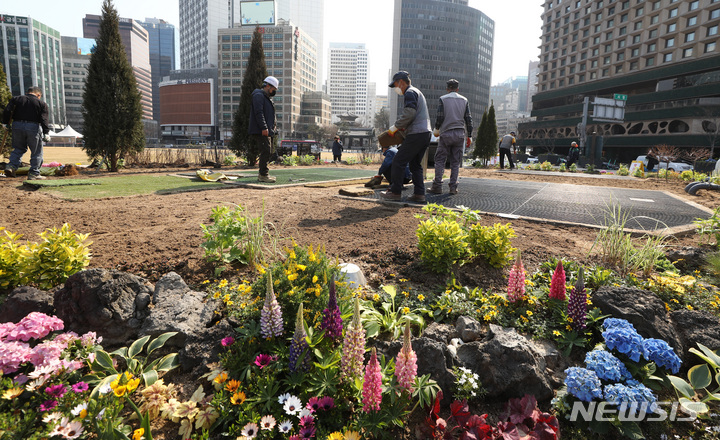 ソウル市中区のソウル広場付近で22日午前、春に合わせて花壇の整備作業が行われているところ。