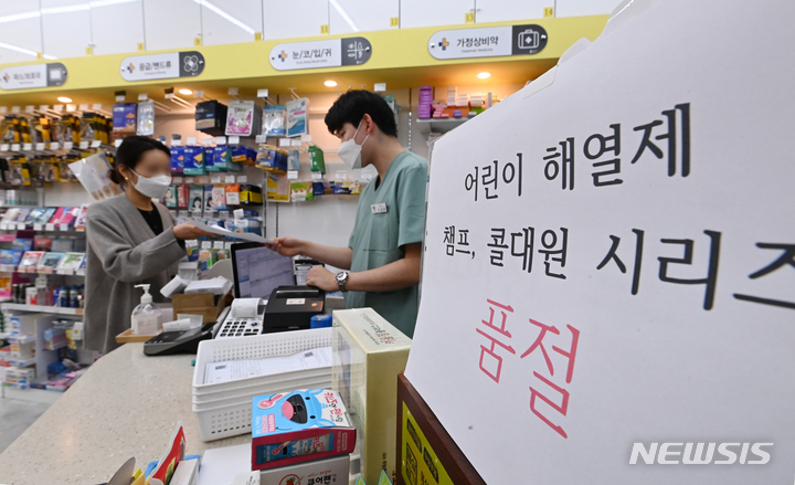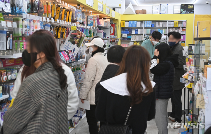 【NEWSIS】新型コロナウイルス感染者が急増し、風邪薬や解熱剤の需要が急増している。写真は22日午後、京畿道水原市の薬局。風邪薬を買い求める人々で混雑していた。