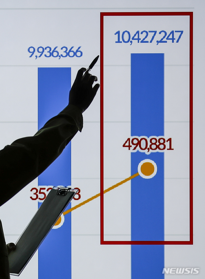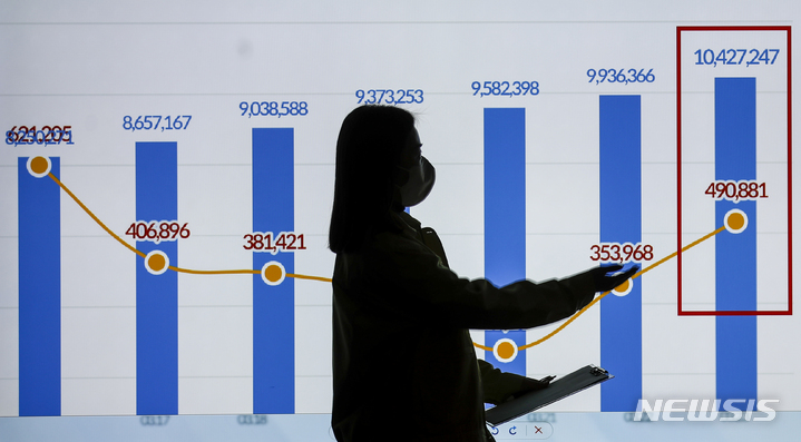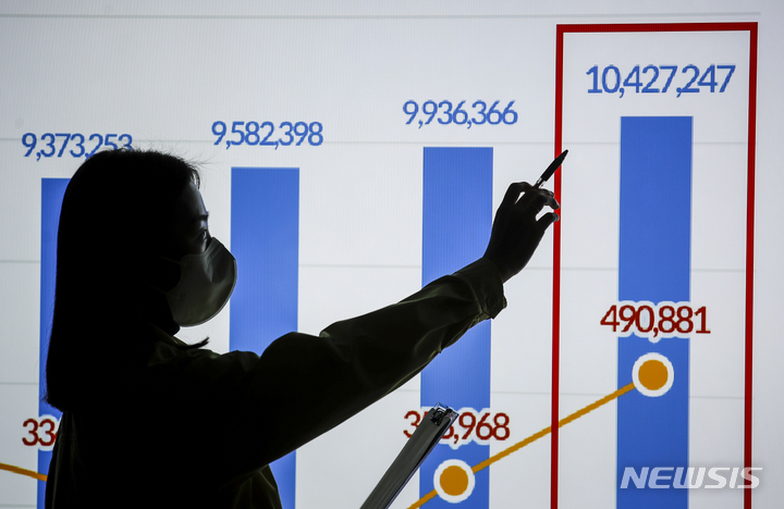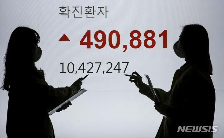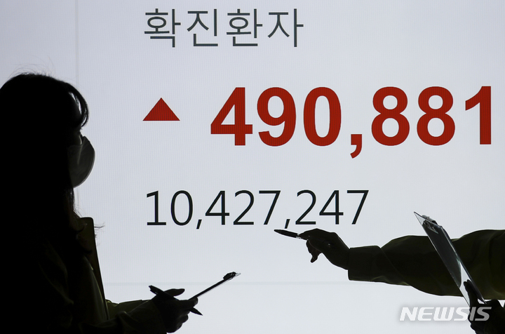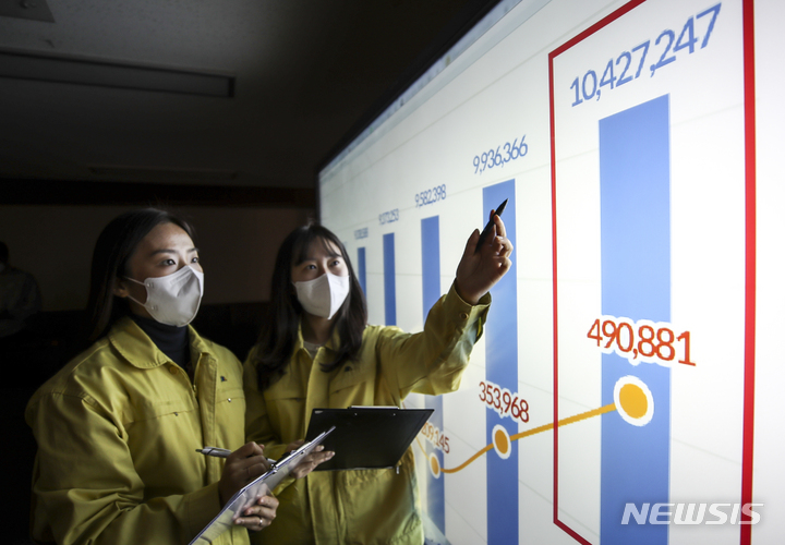 韓国の新型コロナウイルス感染者が通算1000万人を突破した23日午前、ソウル市松坡区庁の状況室では職員らが感染者数をチェックしていた。