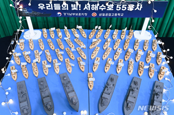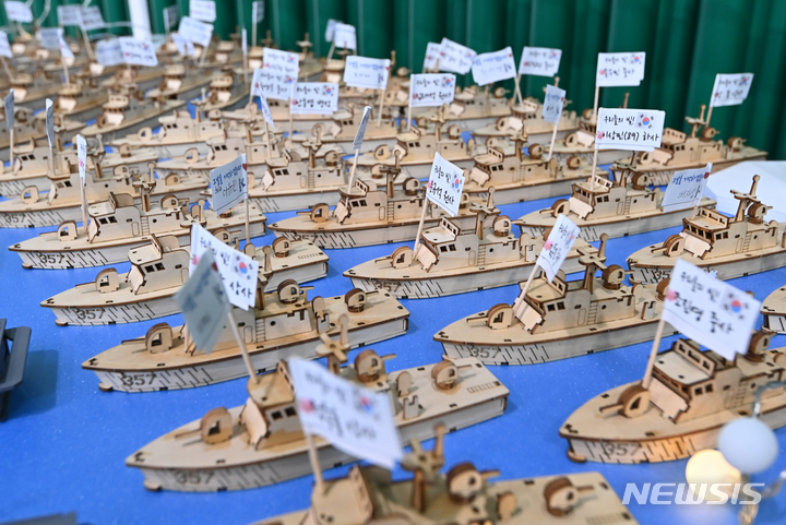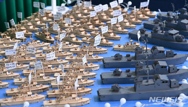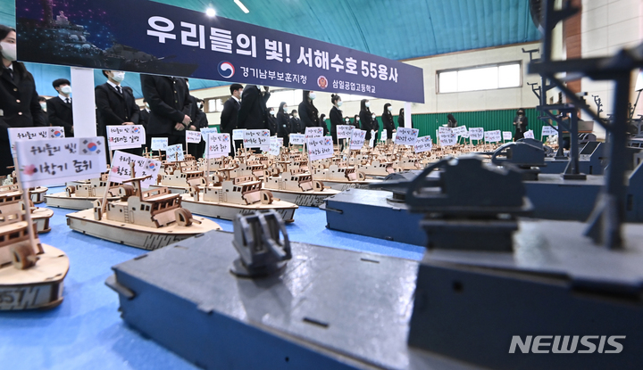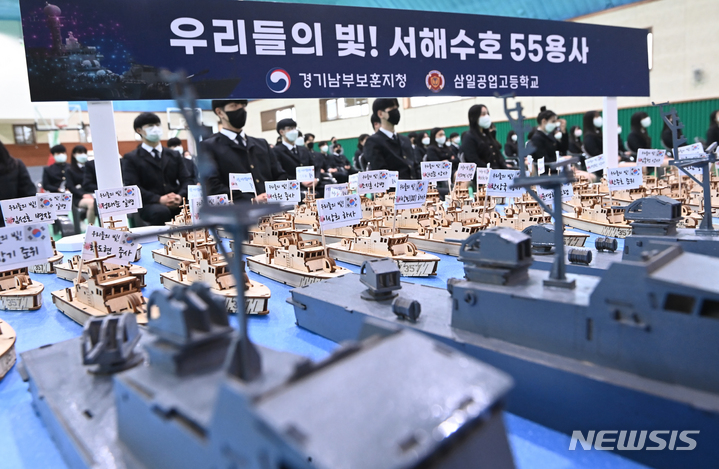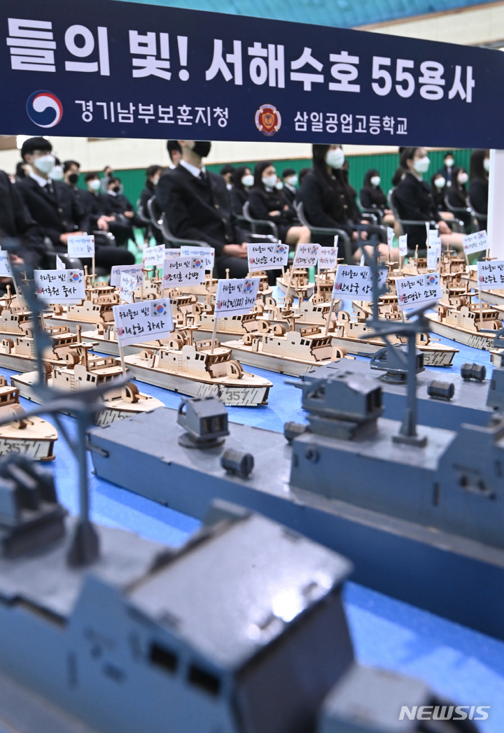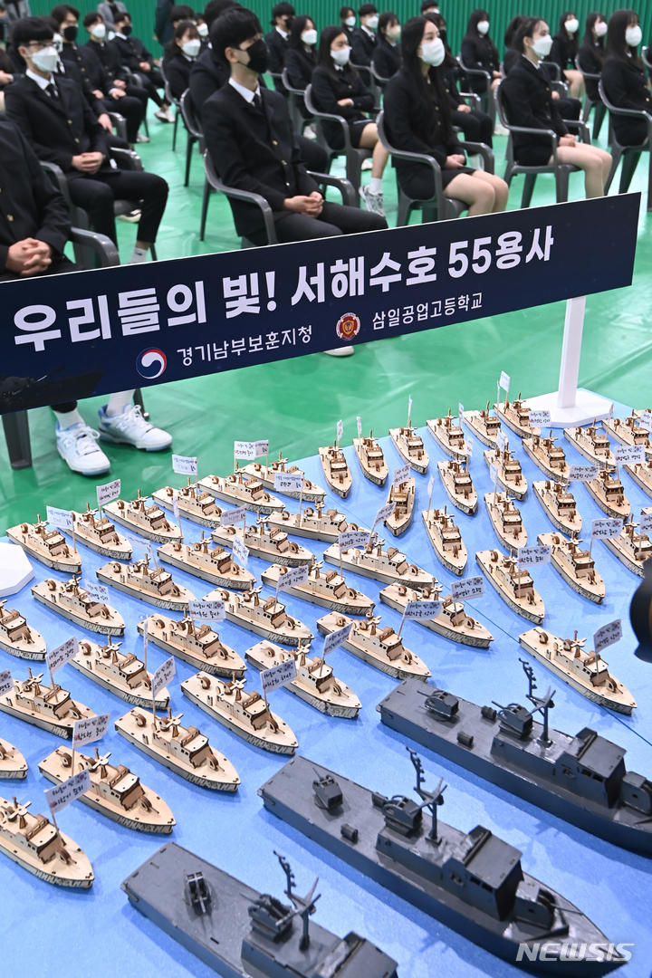 「西海守護の日」まであと二日となった23日午後、京畿道水原市の三一工業高校で開かれた追悼行事で展示された、生徒自身の作った「チャムスリ357号艇」の模型。三一工業高校は、哨戒艦「天安」爆沈事件で戦死した故パク・ギョンス上士(曹長に相当)の母校だ。「西海守護の日」は、第2延坪島海戦、哨戒艦「天安」爆沈事件、延坪島砲撃での戦死者をたたえるために制定された韓国の法定記念日。