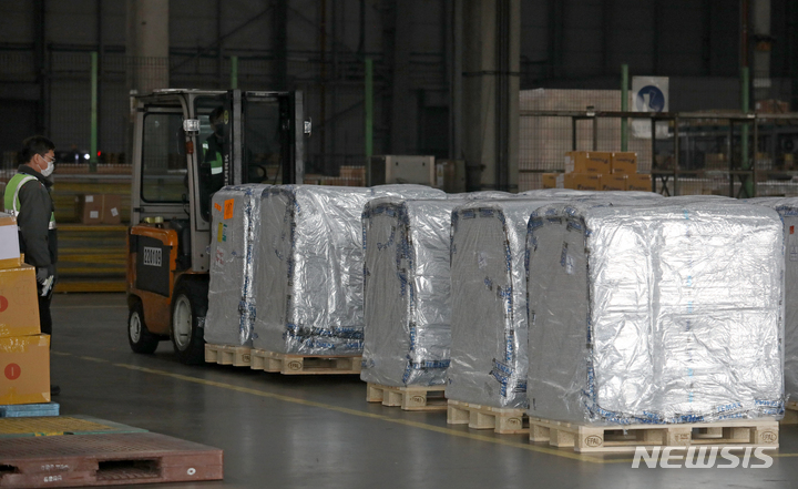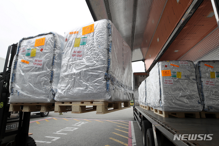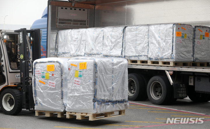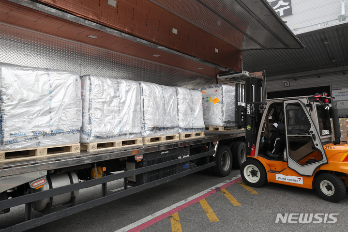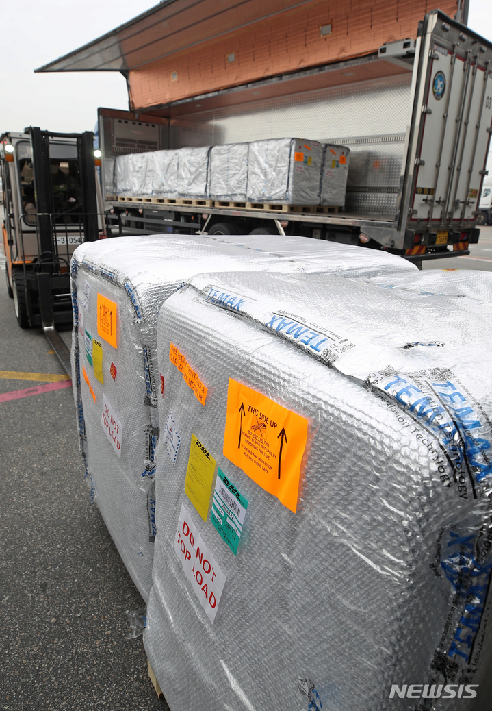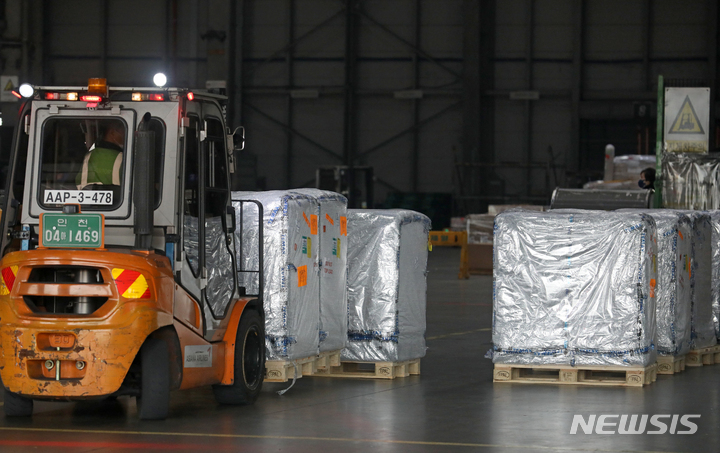米国の製薬大手ファイザーが開発した飲み薬「パクスロビド」4万4000人分が25日午前、仁川国際空港貨物ターミナルに到着し、関係者たちが輸送車両に積み込んでいた。
