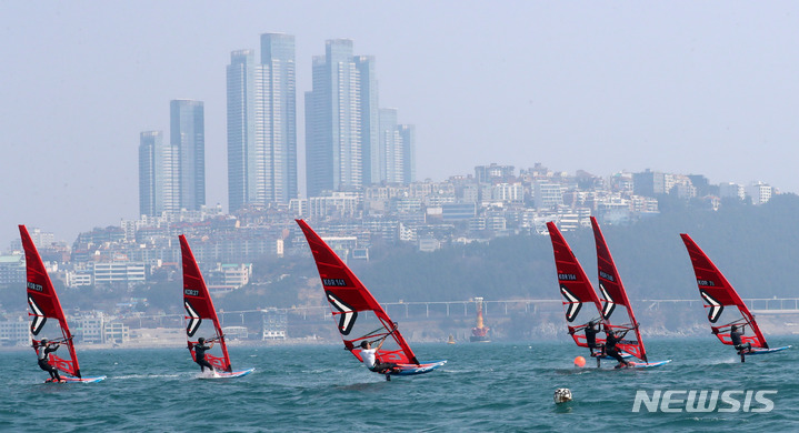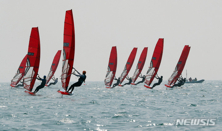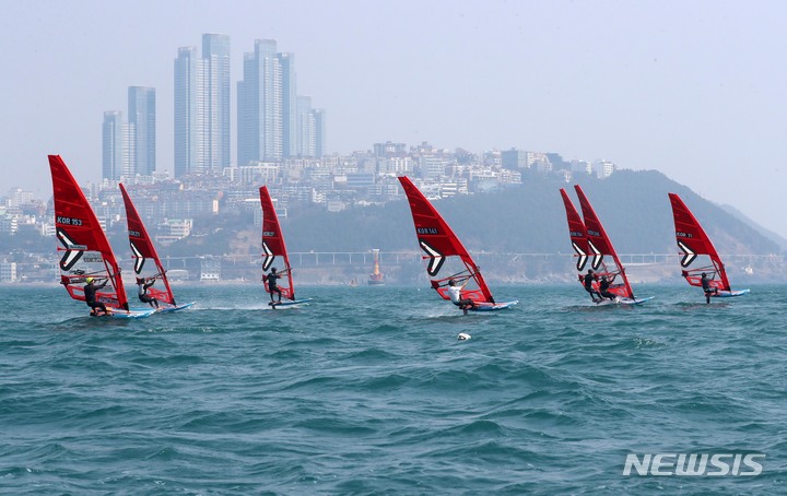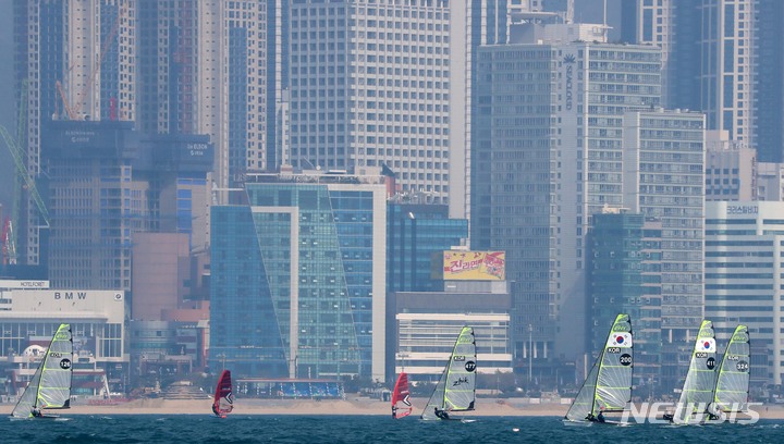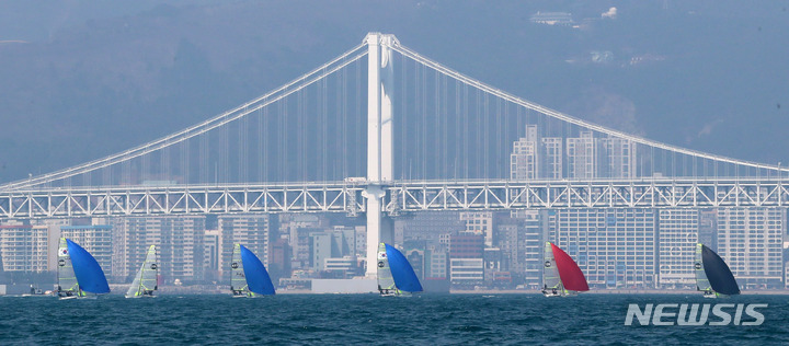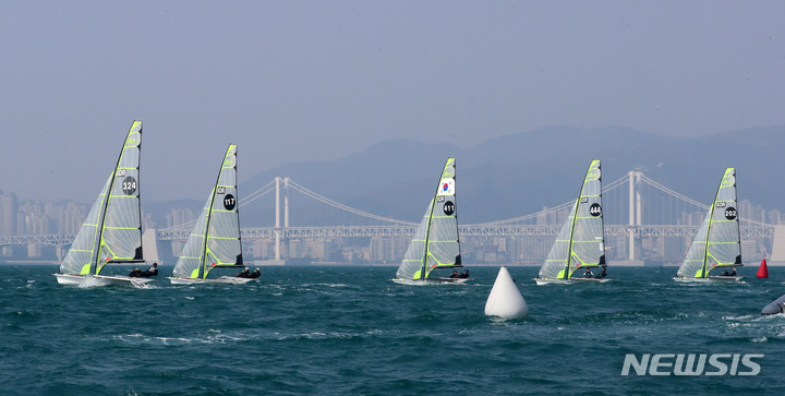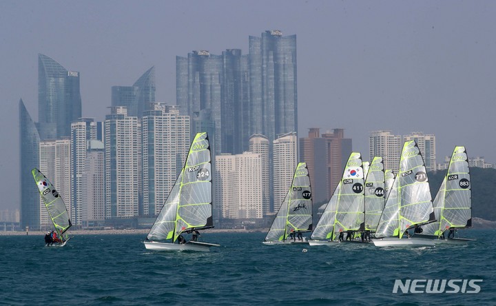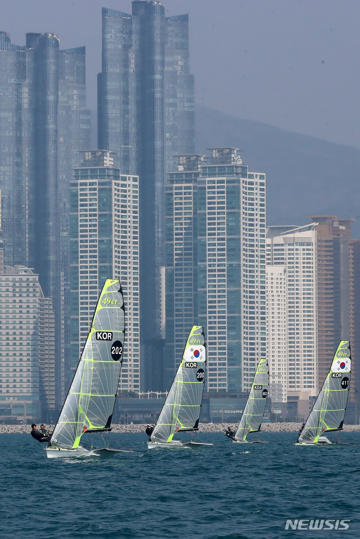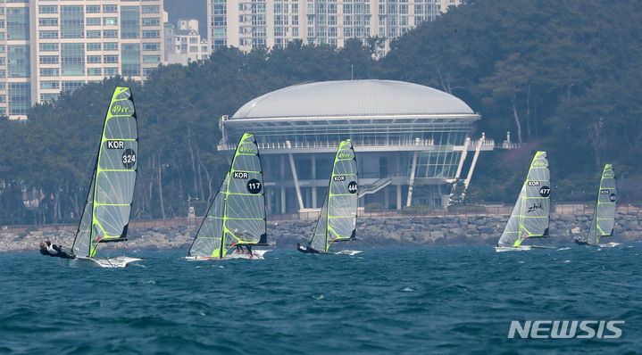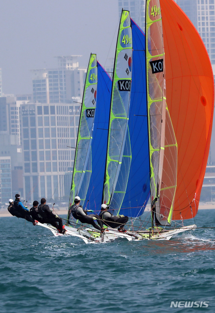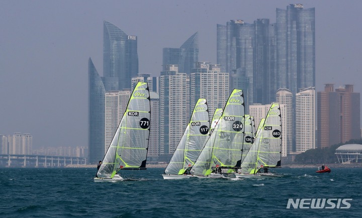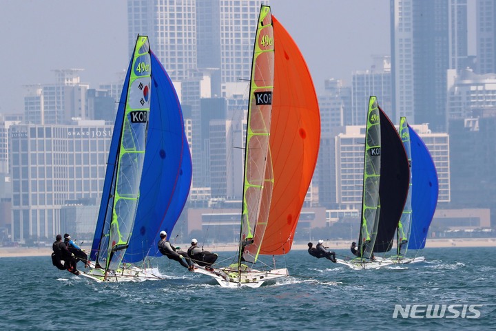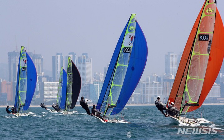 杭州アジア大会(9月10日-25日)を前に、ヨットの第1次韓国代表選抜戦が開かれた24日、釜山沖では「49er」種目に出場した選手らが力強く水を切って疾走した。今回の大会には、初めて設けられた470混成など6種目の選手およそ100人が出場した。