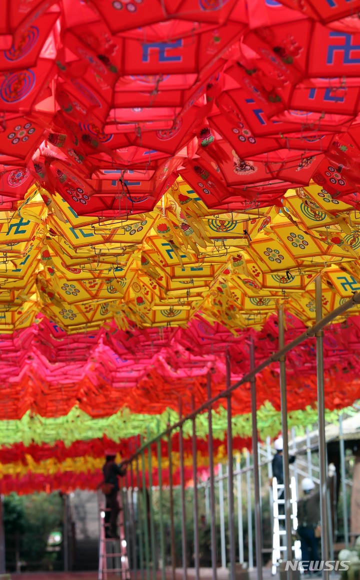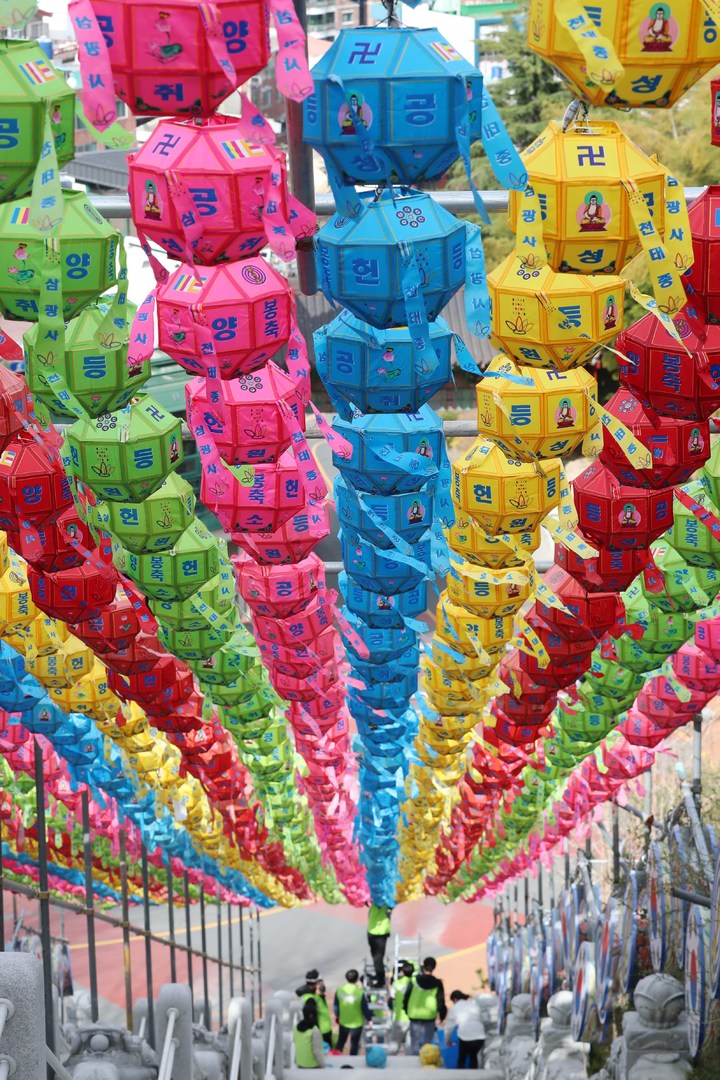 【NEWSIS】釈迦(しゃか)誕生日(5月8日)まで1カ月余りとなった28日、釜山市釜山鎮区の三光寺境内で、色とりどりのちょうちんが飾られた。三光寺では5万張り以上のちょうちんを設置し、来月15日から釈迦誕生日までちょうちん祭りを開催する予定だ。