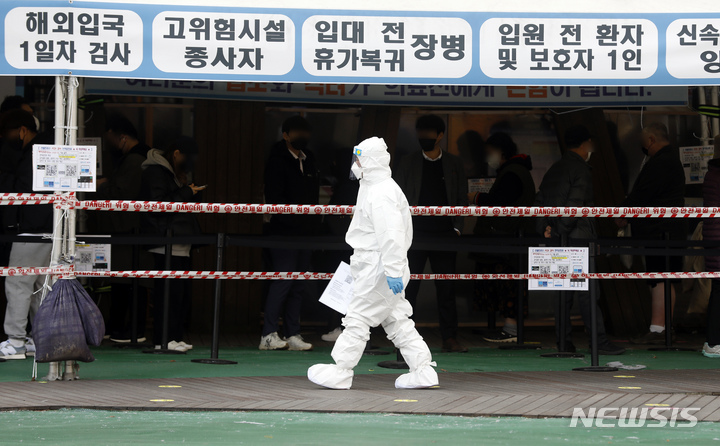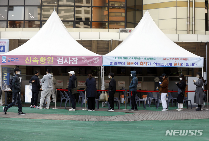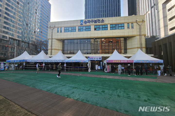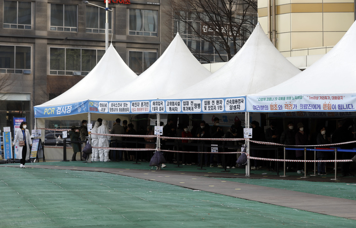 【NEWSIS】新型コロナウイルス一日新規感染者数が午前0時時点で34万7554人と集計された29日、ソウル市松坡区保健所の選別診療所(検査所)を訪れた人々。PCR検査および迅速抗原検査の順番を待っていた。