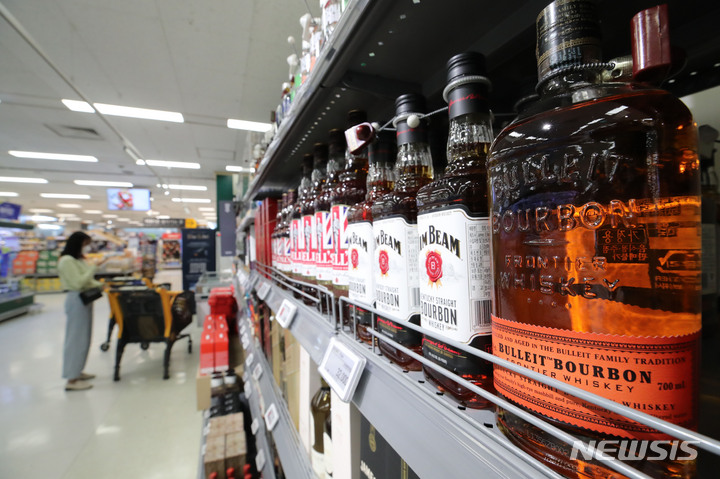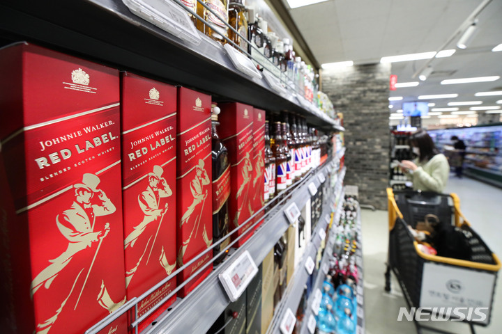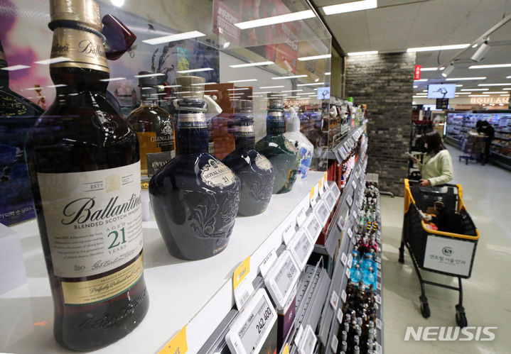 韓国大手スーパー「Eマート」によると、今年1月および2月のウイスキーを中心とした洋酒の売上は、前年同期比で26%の伸びを示した。これは酒類の売上全体の17.2%に当たり、初めて焼酎の売上を上回った。写真は29日午後、ソウル市内の大手スーパーに陳列されたウイスキーの様子。