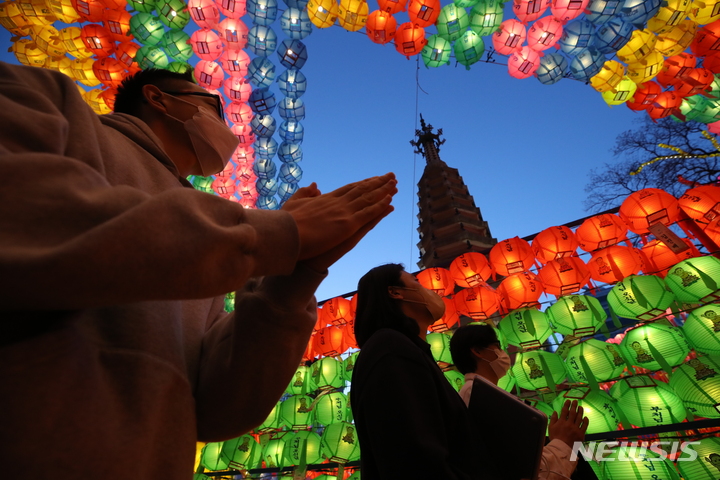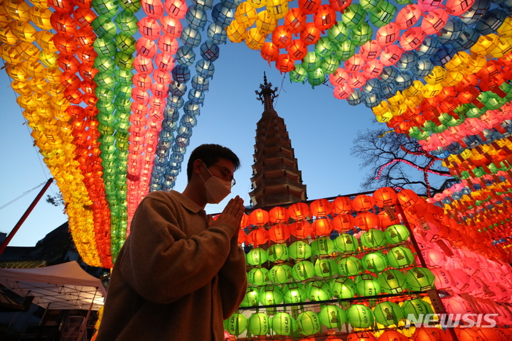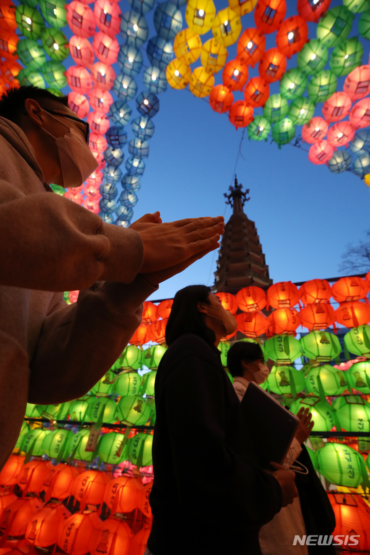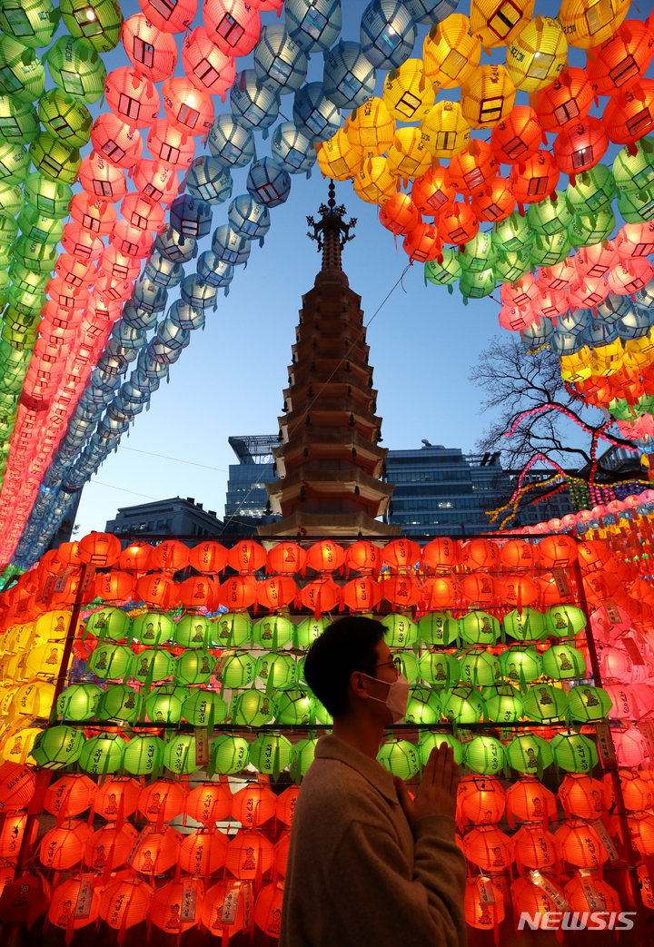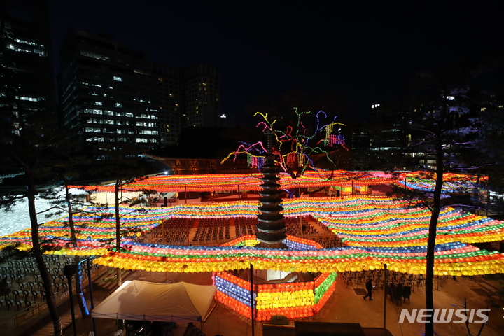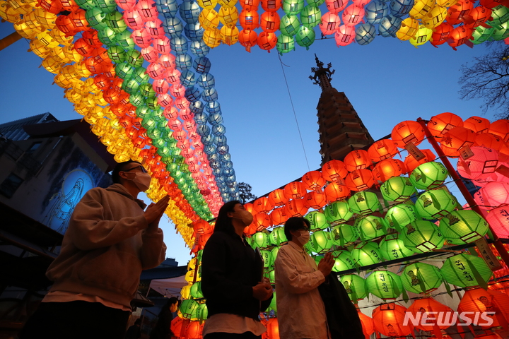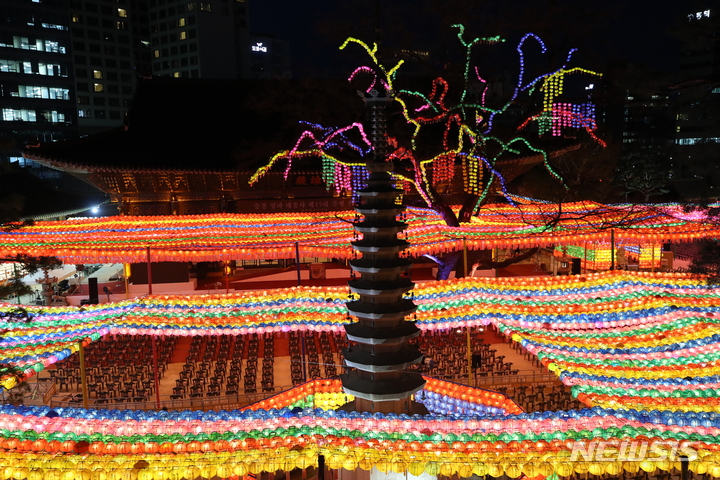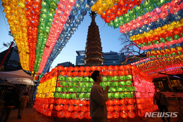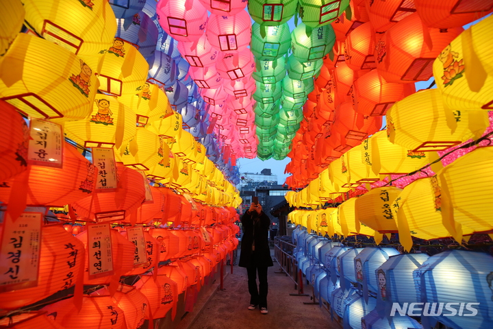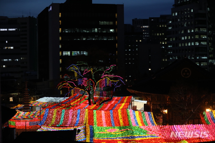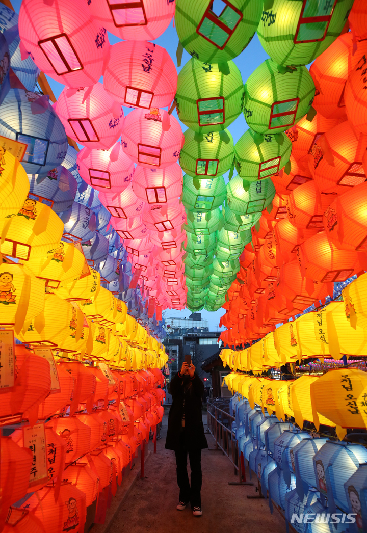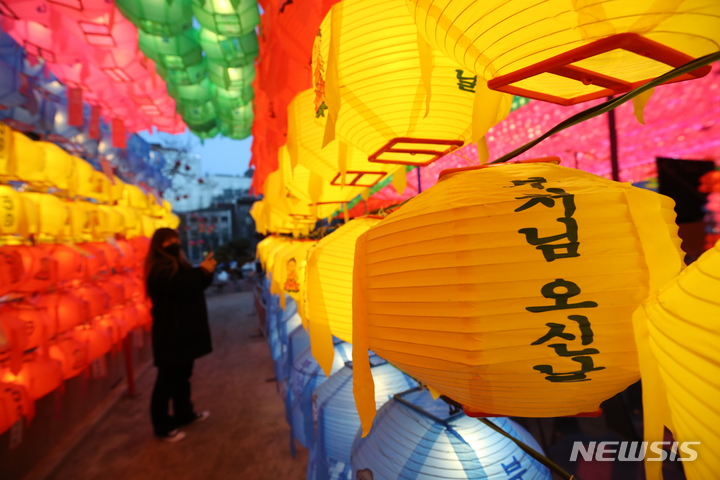 【NEWSIS】仏暦2566年となる釈迦(しゃか)誕生日(5月8日)を控えた29日、ソウル市鍾路区の曹渓寺には色とりどりのちょうちんが飾り付けられた。