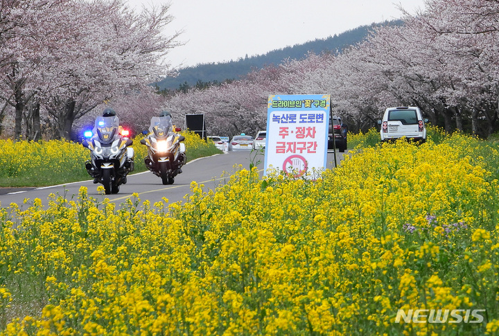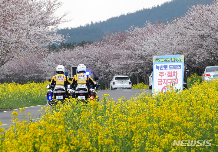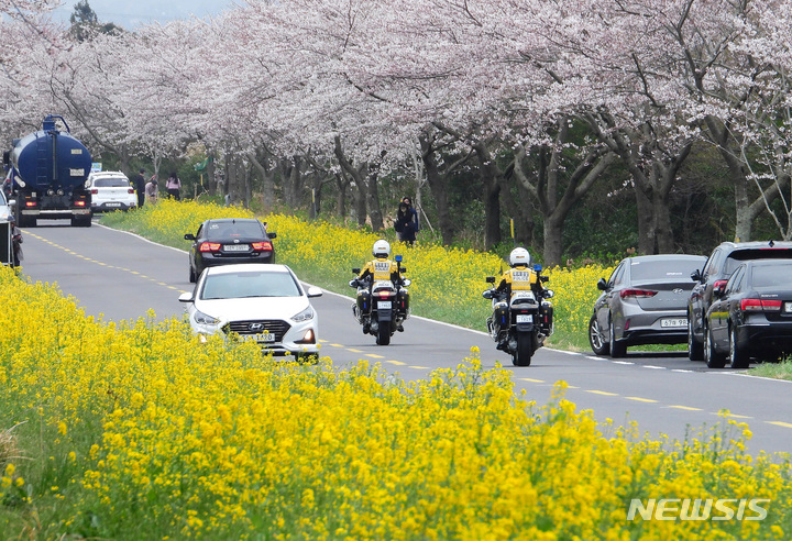 済州山間部および南部を中心に雨が降るなど有れた天気となった30日午後、済州島西帰浦市表善面の鹿山路では、済州自治警察団(団長:コ・チャンギョン警務官〈警視長に相当〉)所属の警察官が白バイに乗ってパトロールを行っていた。