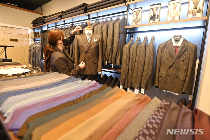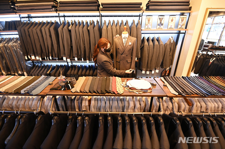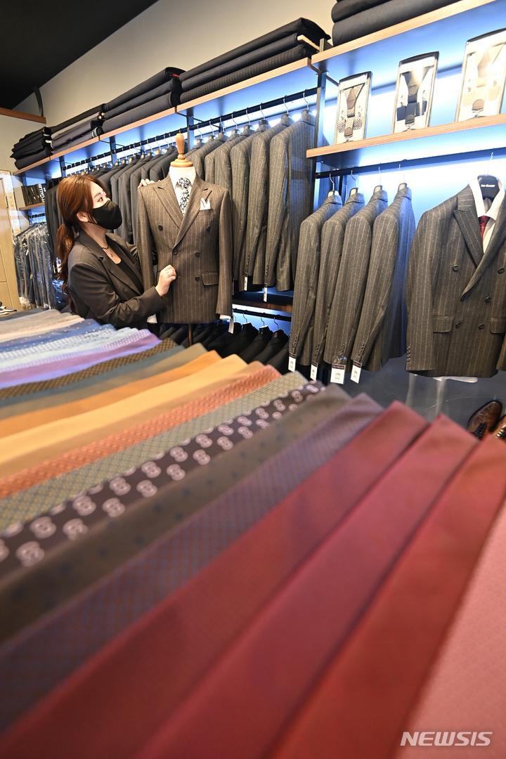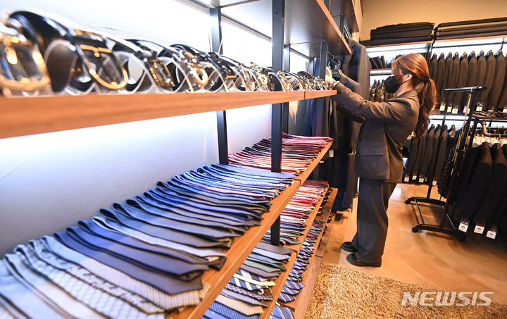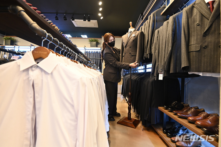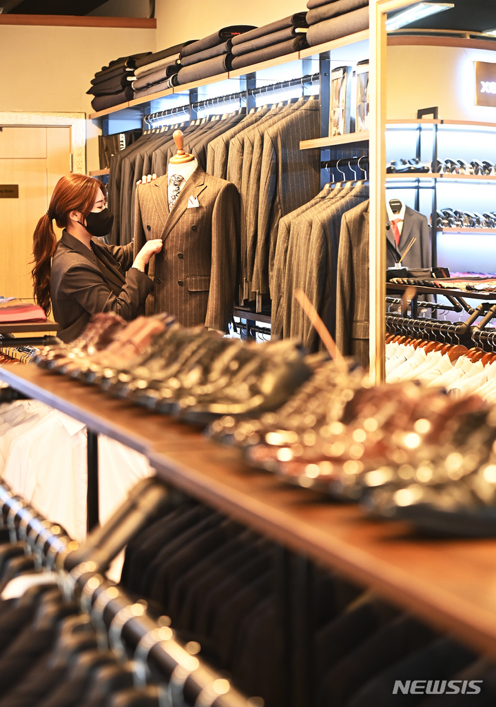 京畿道水原市が就職準備中の青年を対象に、面接用の正装を貸与する「チョンナレ」事業を開始した。事業に参加する京畿道水原市霊通区のスーツギャラリーでは31日、従業員が貸与用の正装を見て回っていた。1人あたり年に3回借りることができ、貸与期間は3泊4日。