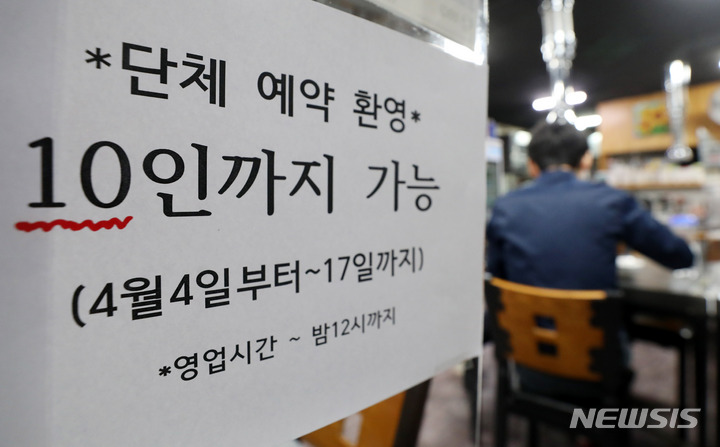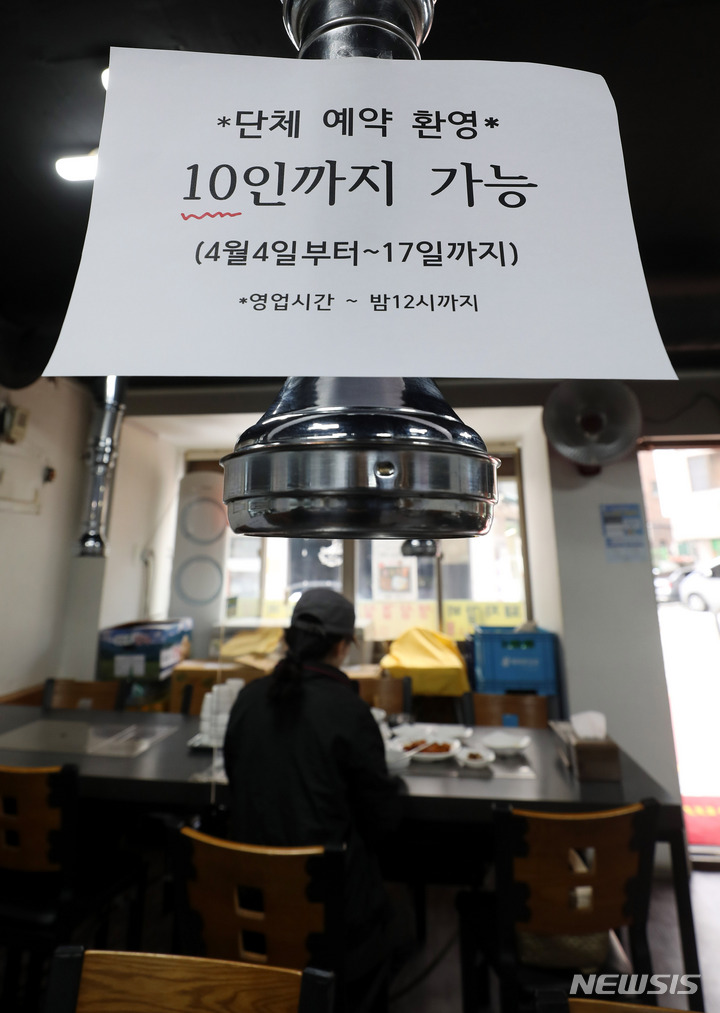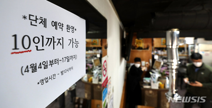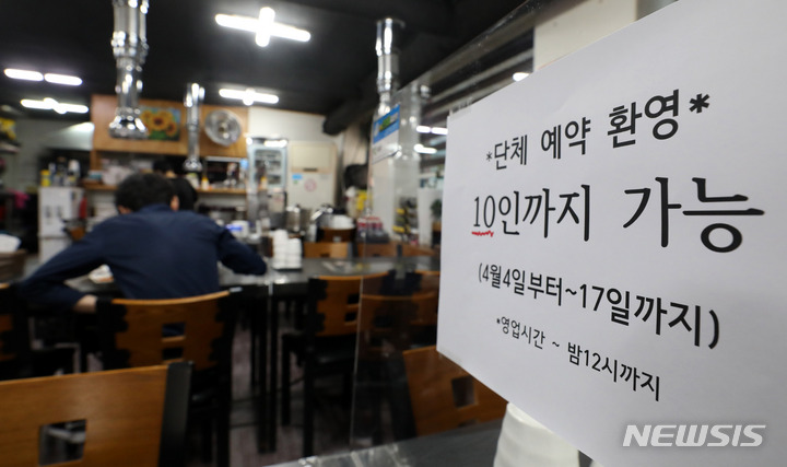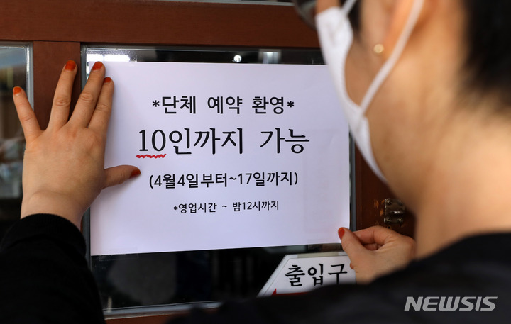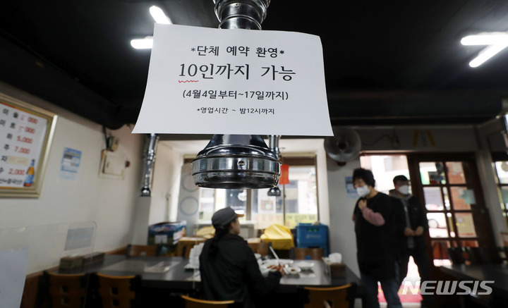 「私的な会合の人数上限は10人、営業時間は夜12時まで」という新たなソーシャルディスタンス指針が発表された1日午後、ソウル市内のある飲食店に「団体予約歓迎」など新ソーシャルディスタンス関連の案内が張り出されている様子。
