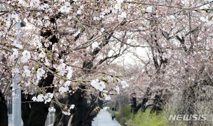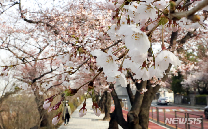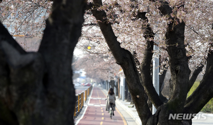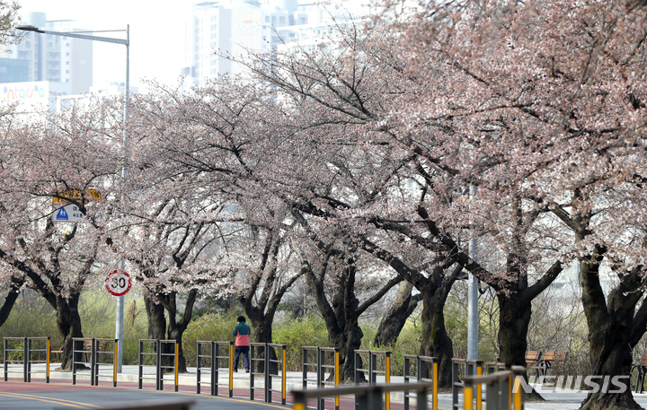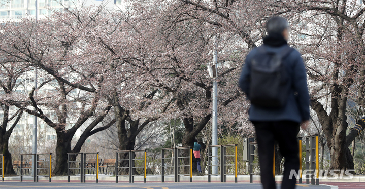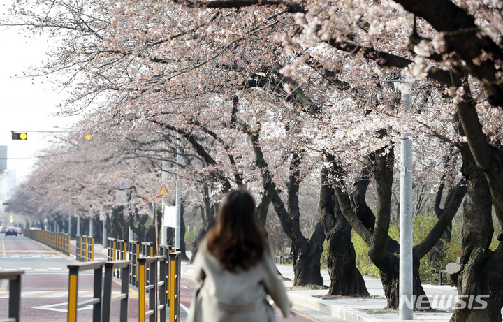 【NEWSIS】5日午前、桜が満開になったソウル・汝矣島の輪中路一帯。ソウルの桜が最も早く開花した昨年と比べ、今年は開花が11日遅かった。