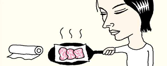 フライパンでサムギョプサル(豚バラ肉)の焼肉を作る時は、クッキングシートを敷いてから焼くと、油が跳ねず、洗い物も楽に済ませられる。