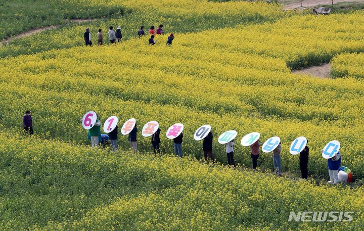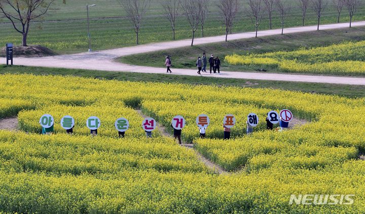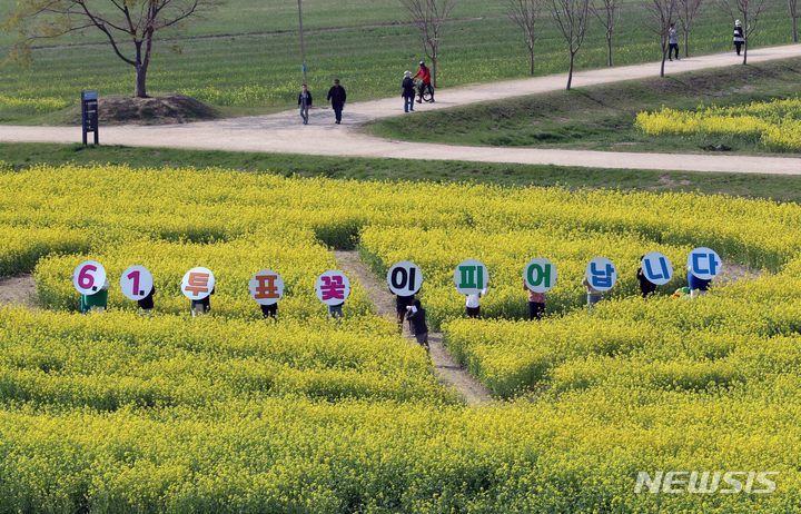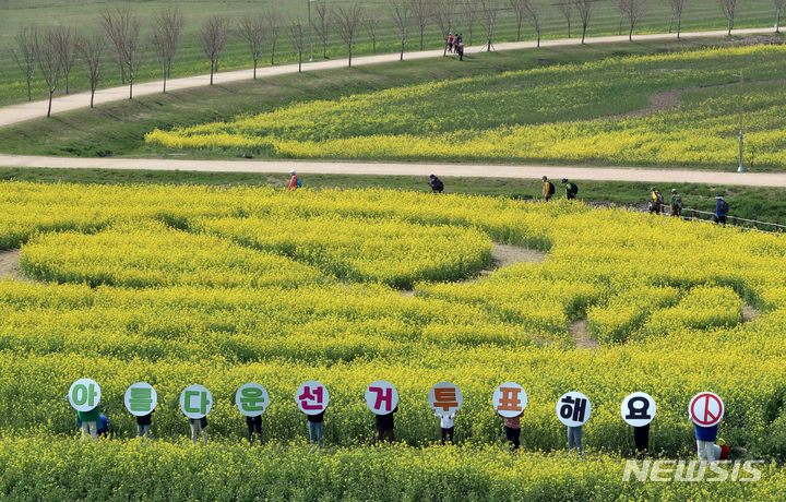 第8回全国同時致富選挙まであとおよそ50日となった6日、大渚生態公園(釜山市江西区)の菜の花畑にて、投票用紙への記入記号の形を模して造成された道で釜山市選管委の職員らが投票への参加をPRした。