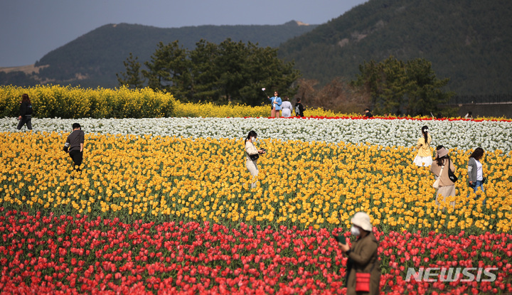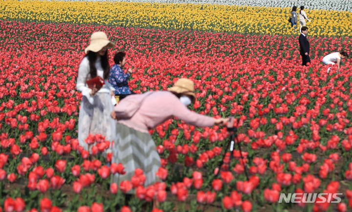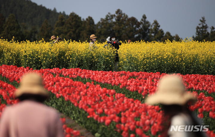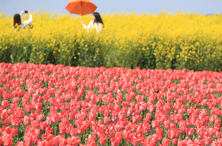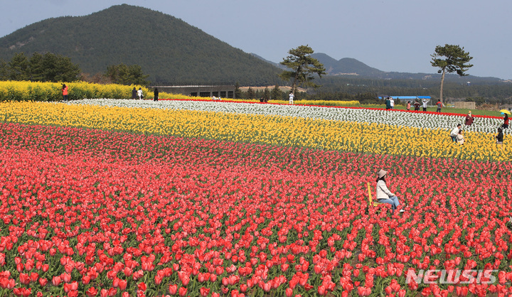うららかな春の天気となった6日午後、済州島西帰浦市表善の「ボロムワット」農場では、訪れた観光客が大きく咲いたチューリップを見物していた。韓国気象庁によると、この日の済州島は一部の地域で昼間の気温が20度を超えるなど、温かい天気となった。
