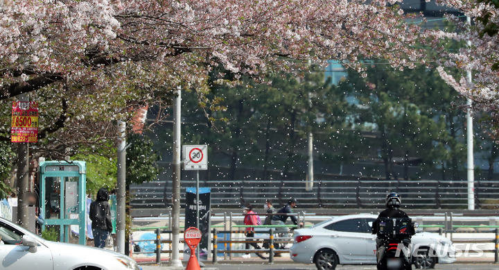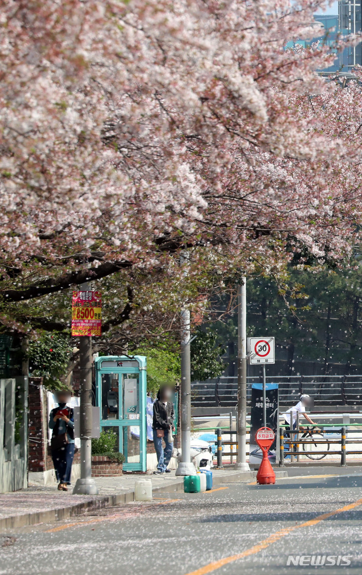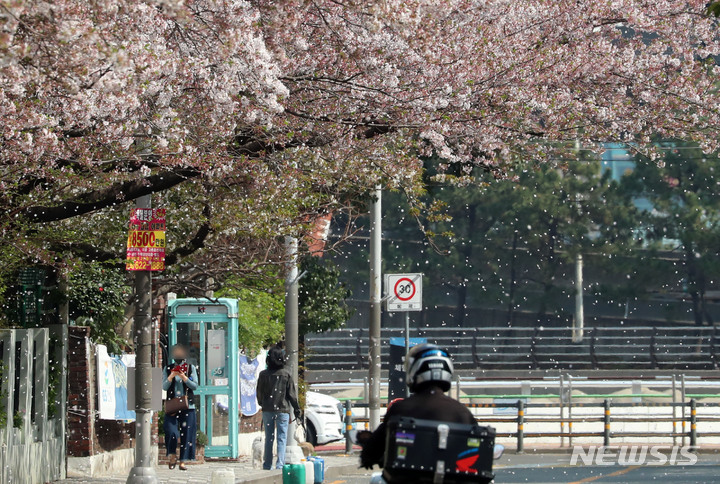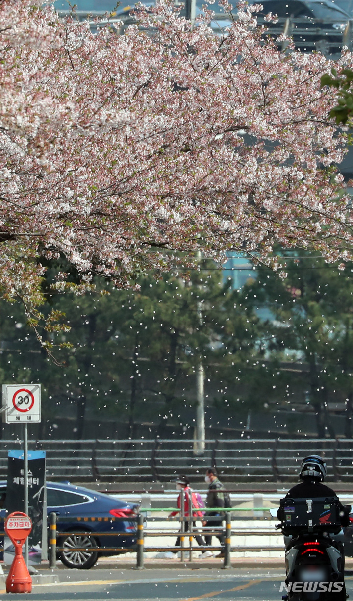 【NEWSIS】釜山地域の最高気温が19.8℃に達した7日午後、釜山市水営区のあるマンション敷地内では、春の雨のように桜の花びらが降り注いでいた。