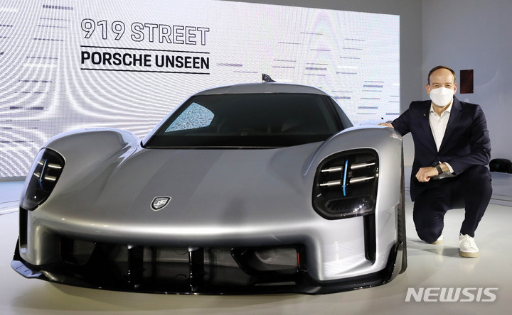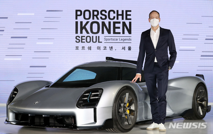 【NEWSIS】8日午前、ソウル市中区の東大門デザイン・プラザで行われた展示会「PORSCHE IKONEN, SEOUL(ポルシェ・イコネン、ソウル)」に出席し、アジアで初公開される高性能ハイパーカー・コンセプト・モデル「919 STREET(ストリート)」と記念撮影するポルシェ・コリアのホルガー・ゲアマン(Holger Gerrmann)代表。