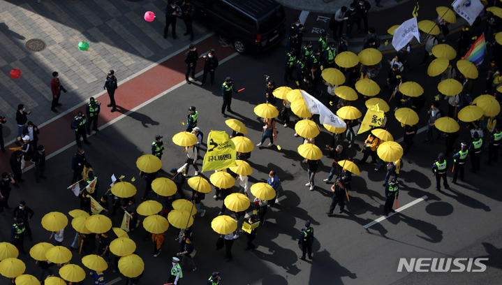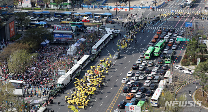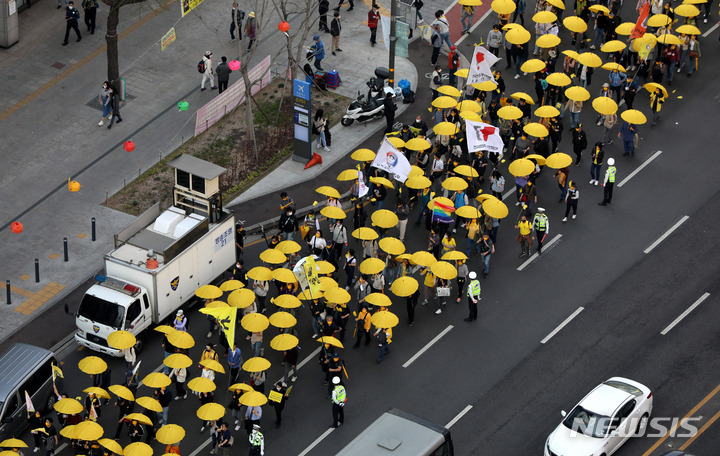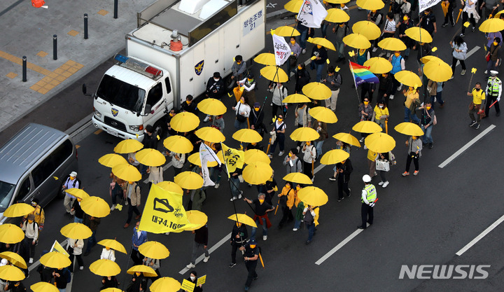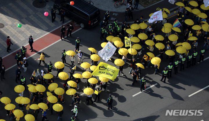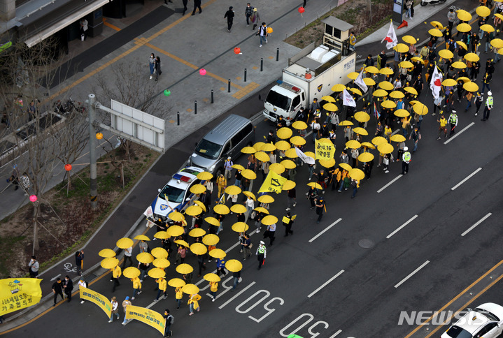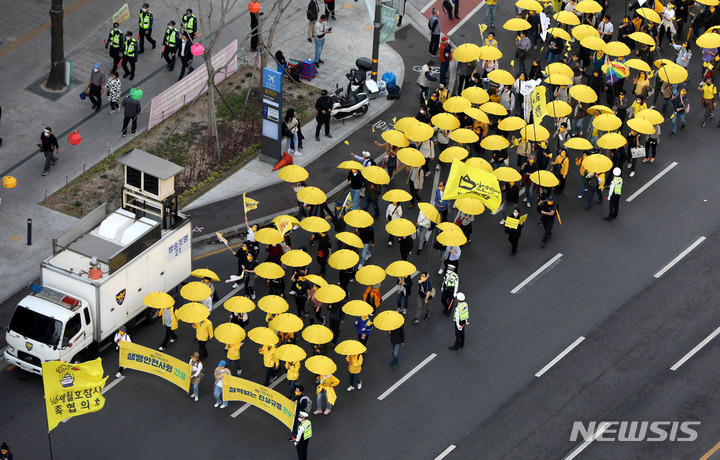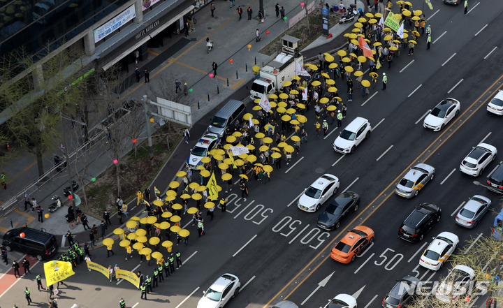 「セウォル号惨事8周忌国民大会および市民行進」が開かれた9日午後、ソウル市中区のソウル市議会前に設置された「セウォル号記憶空間」前で行進する参加者らの様子。