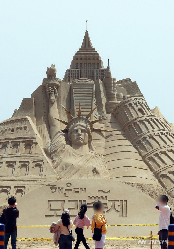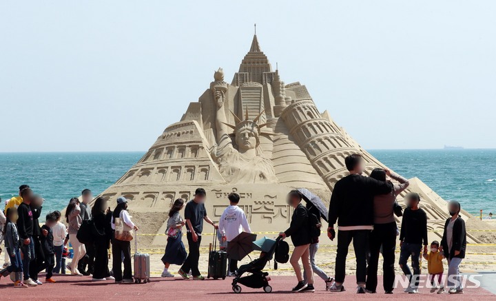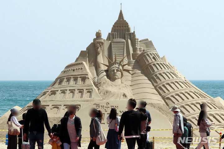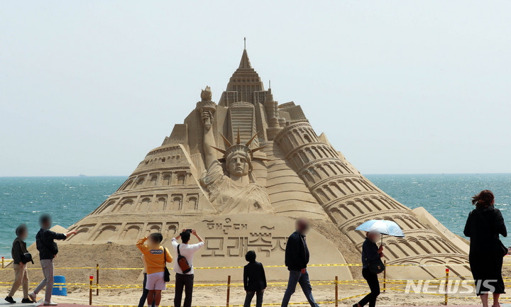 【NEWSIS】全国的に初夏の陽気となった10日、釜山市海雲台区の海雲台海水浴場入り口に大型の砂の彫刻作品が制作され、市民や観光客が見入っていた。同区では5月20日から23日まで「2022年海雲台砂祭り」を開催する。今回の砂祭りでは世界各国のランドマークを砂で表現した作品15点が披露される予定だ。