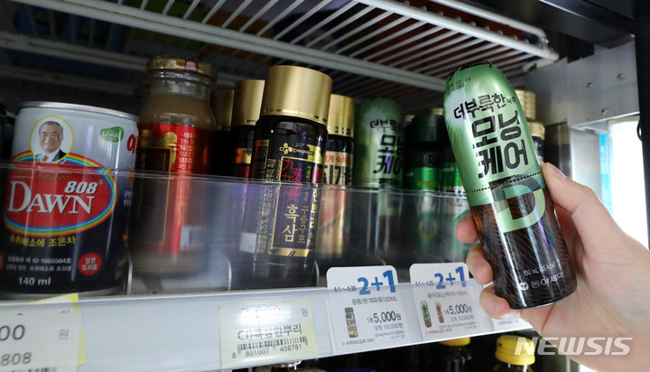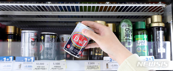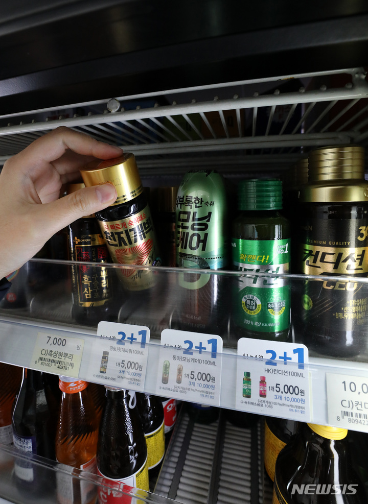 ソーシャルディスタンスの緩和によりレストランや居酒屋などの営業時間が伸び、私的な会合の人数上限も増えたことで、二日酔い解消用の飲料の売上が伸びている。写真は11日、ソウル市内のコンビニに並んだ二日酔い解消用の飲料。