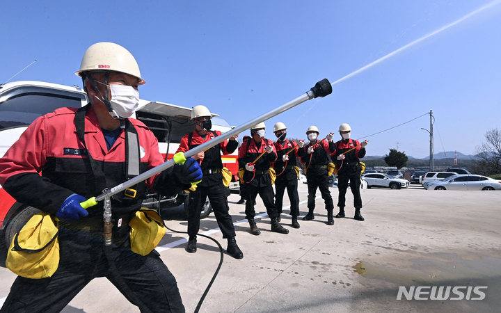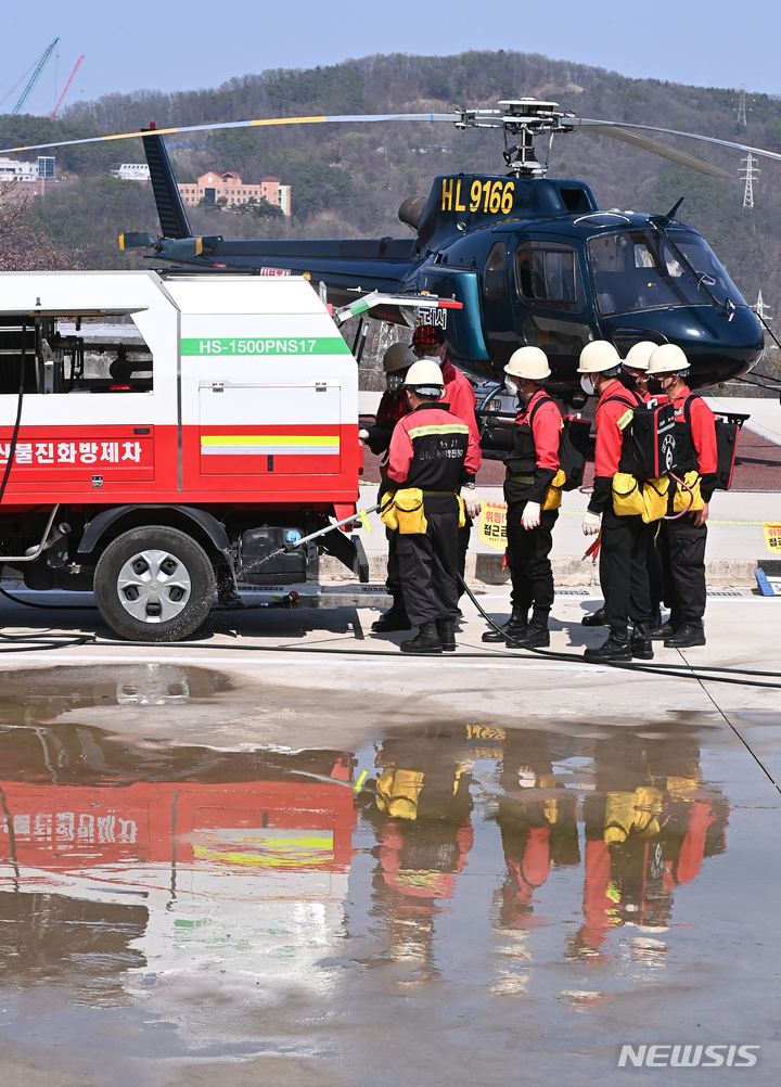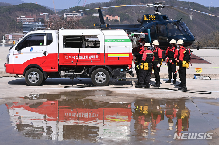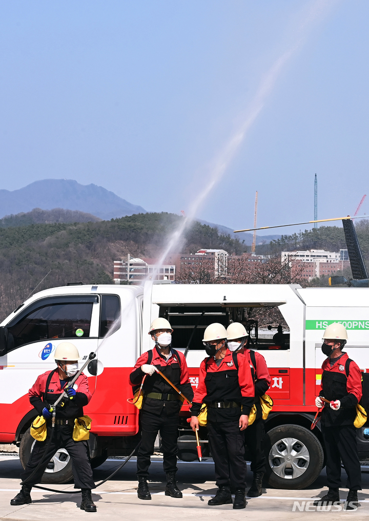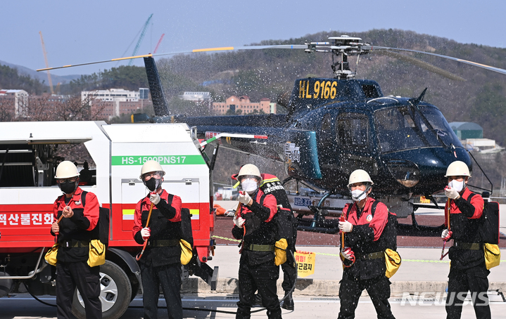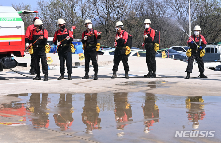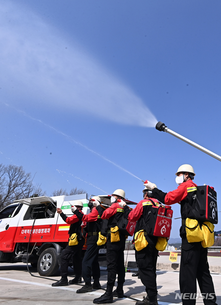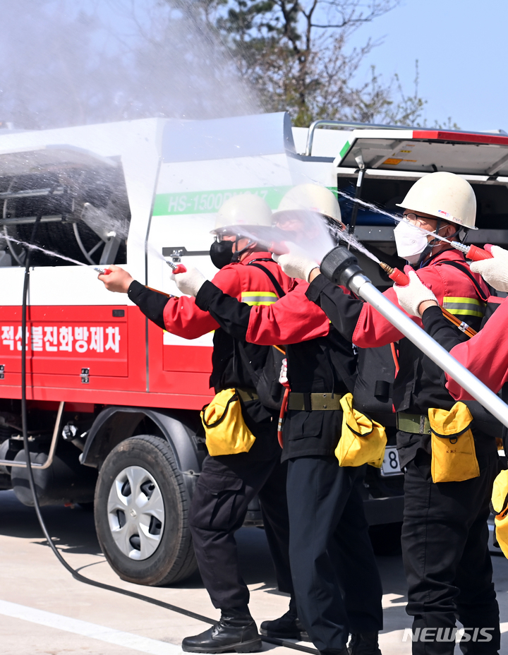 京畿道竜仁市処仁区の山火事対応センターで11日午後、山火事予防鎮火隊員らが装備を点検している様子。