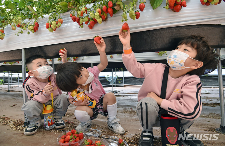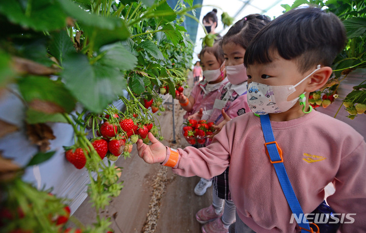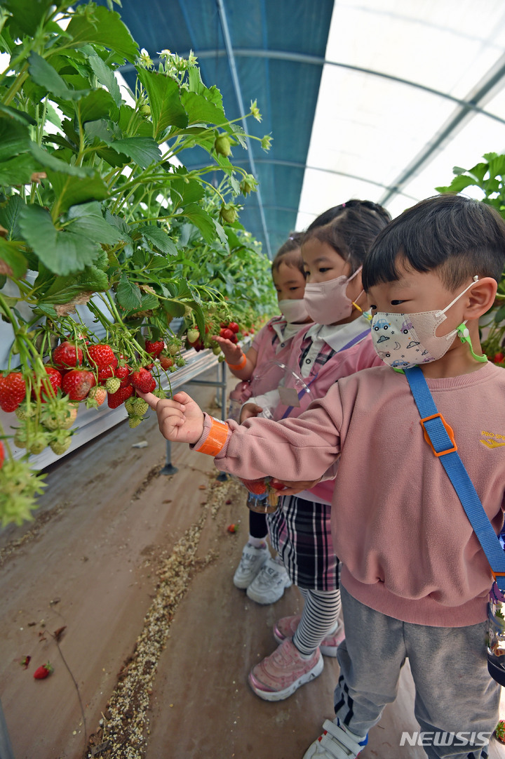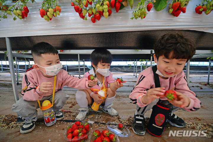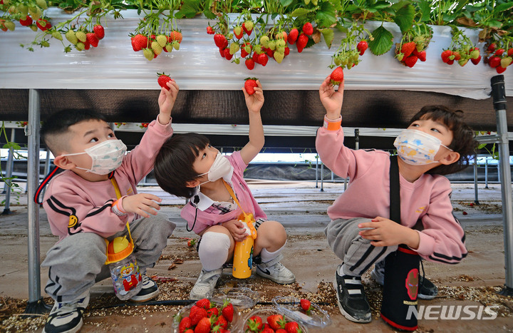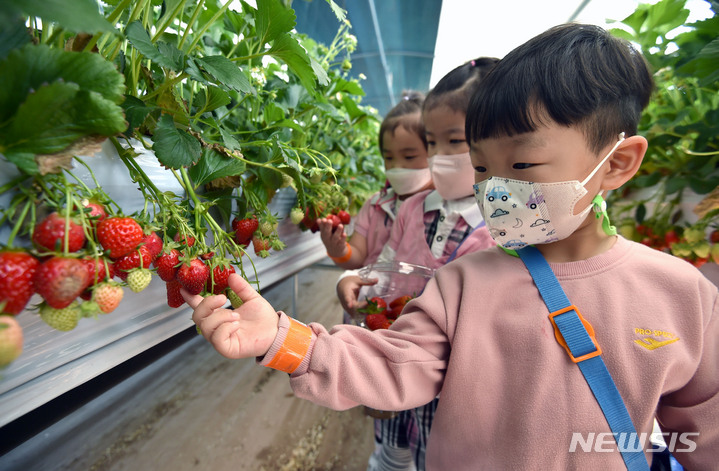 大邱市東区百安洞のホガム農場ビニールハウスで12日午前、子どもたちがイチゴ狩り体験をしながら楽しいひとときを過ごした。