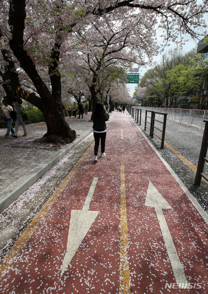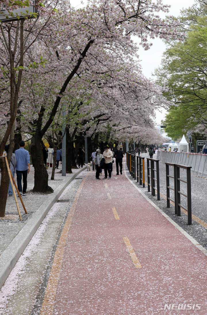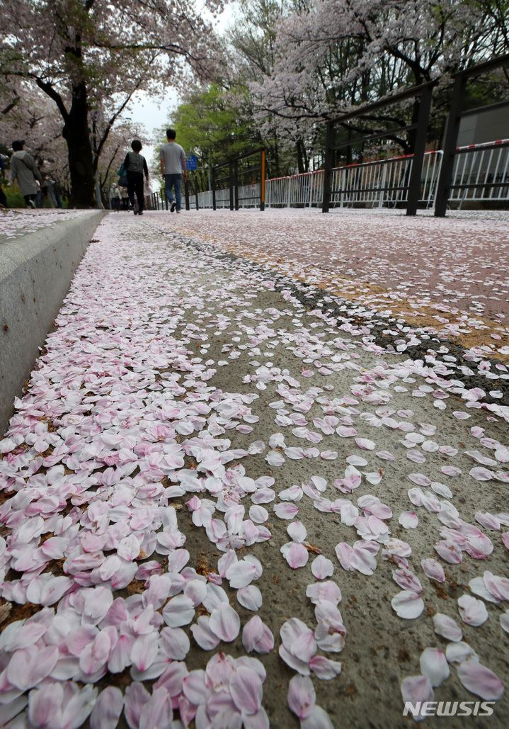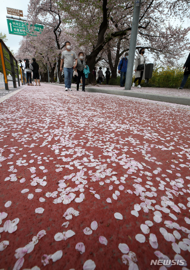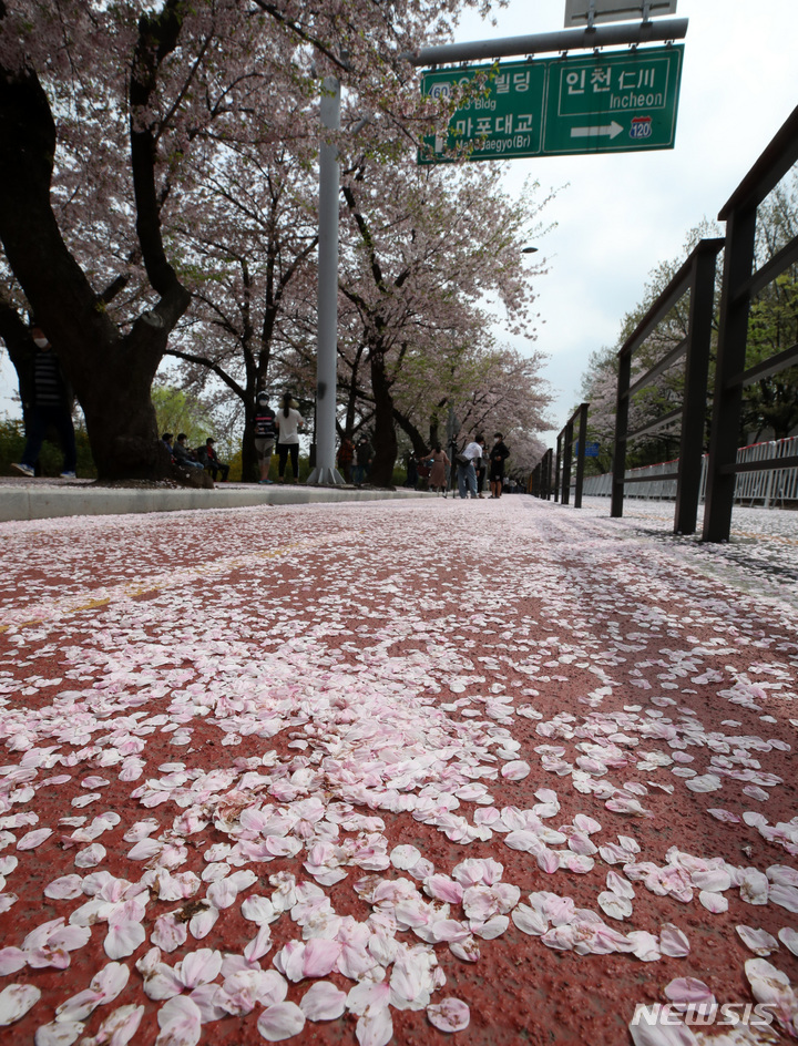 12日午前、ソウル市永登浦区輪中路のサクラ並木道(汝矣西路)は、地面に落ちたサクラの花びらでいっぱいになっていた。