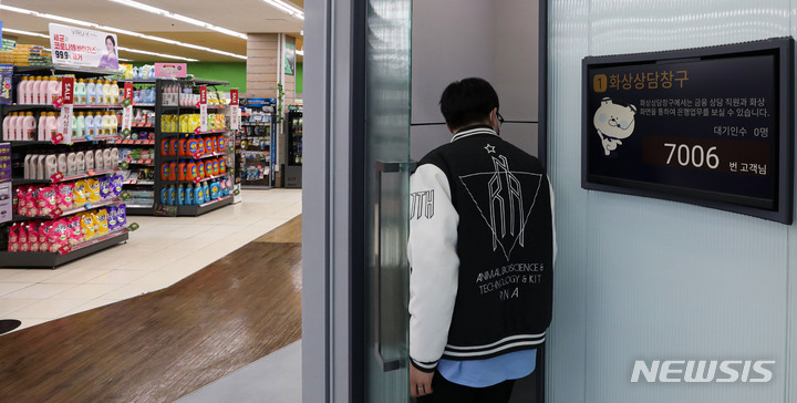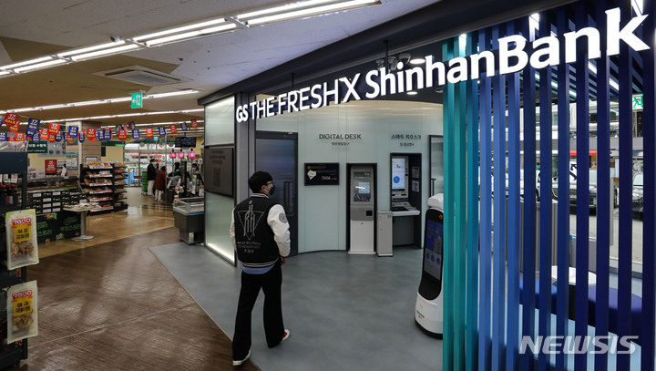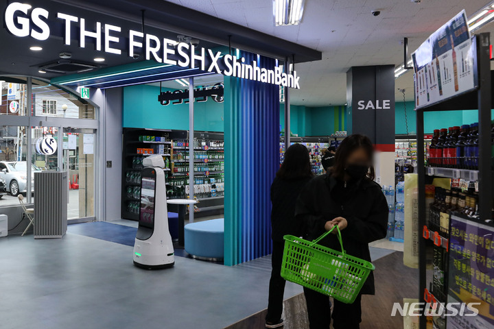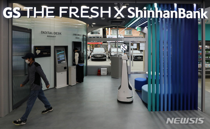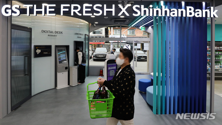 ソウル市広津区のGS THE FRESH広津華陽店で13日午後、店を訪れた人々が買い物をしている様子。GSリテールは新韓銀行と協力し、広津華陽店を「デジタル革新店舗1号店」へと脱皮させた。従来のATMより高度化されたデジタルデスクやスマートキオスクなどを設置し、預金・積立・融資など各種窓口サービスの80%以上を処理できる。