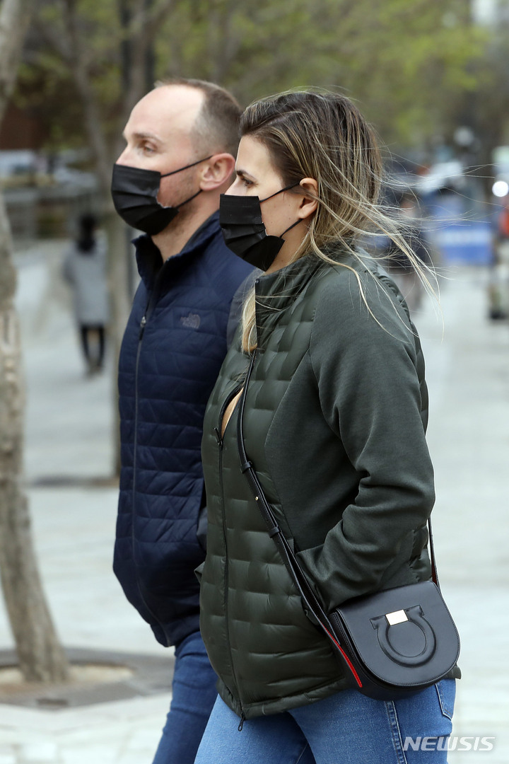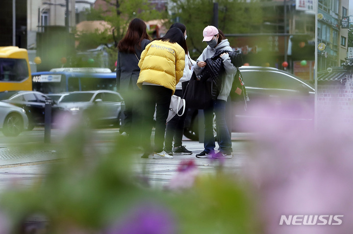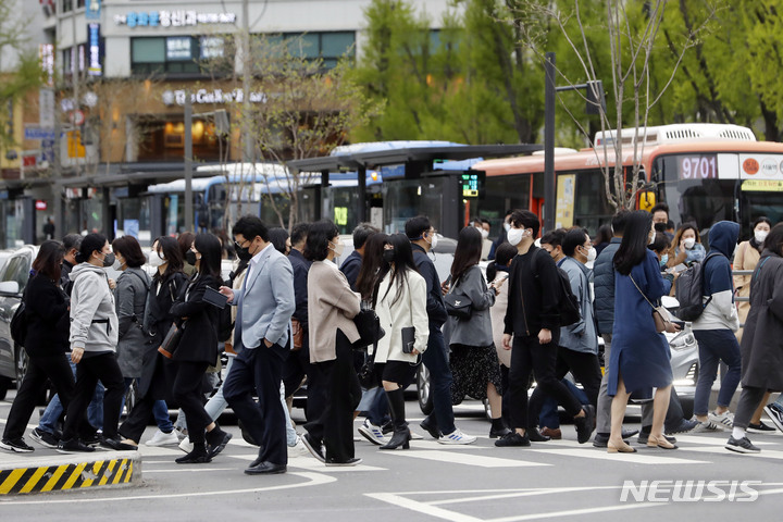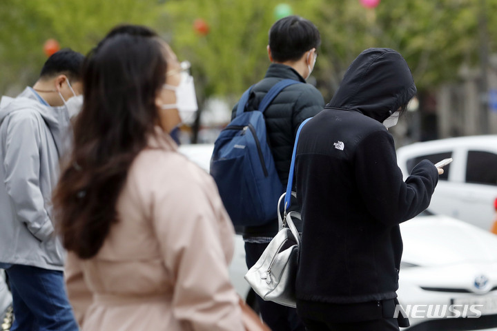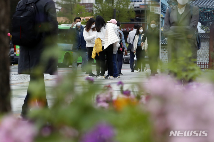 雨が降り肌寒い一日となった14日午前、ソウル市内の世宗路交差点を通って出勤する市民たち。