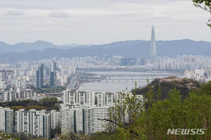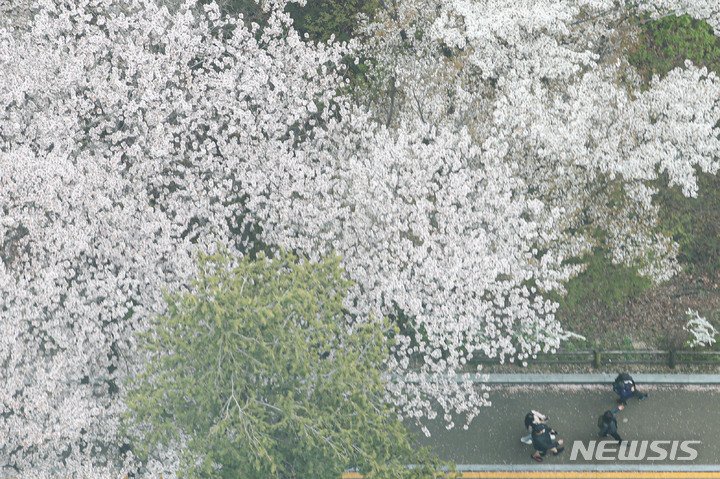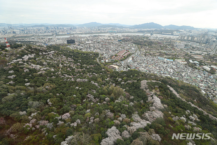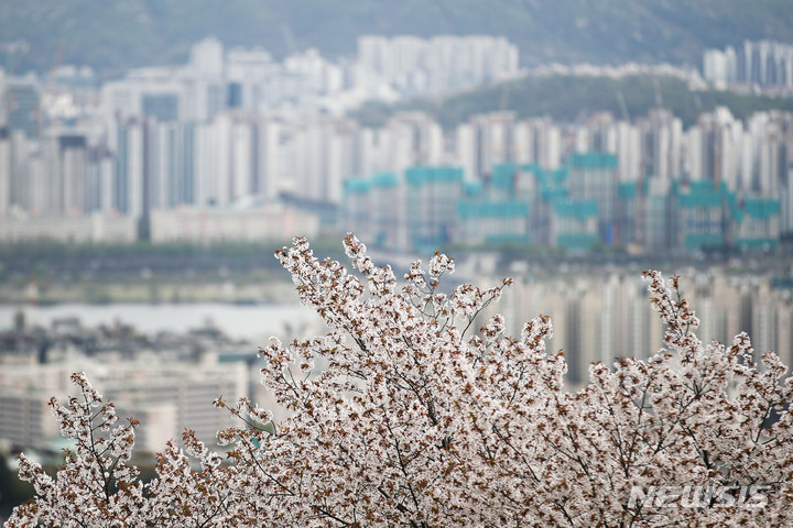 粒子状物質の濃度が「良い」の状態となった14日午後、ソウル市竜山区の南山公園でサクラが満開になっている様子。