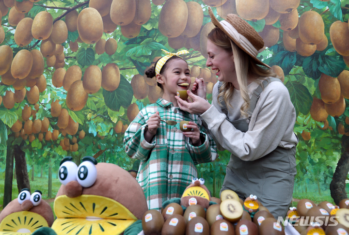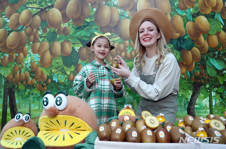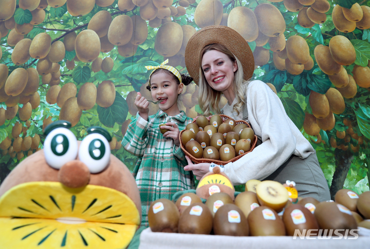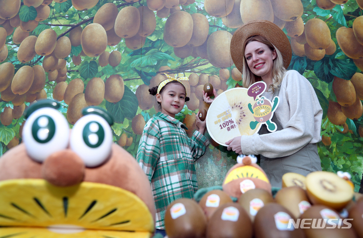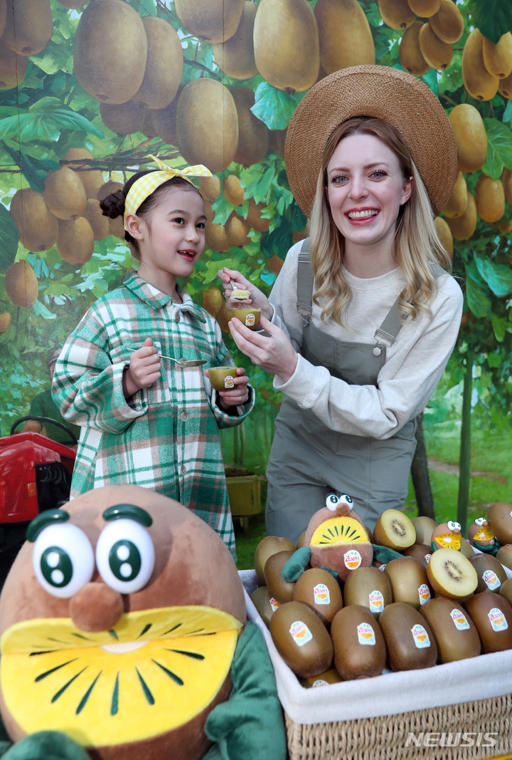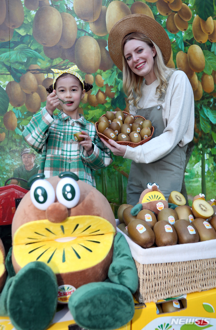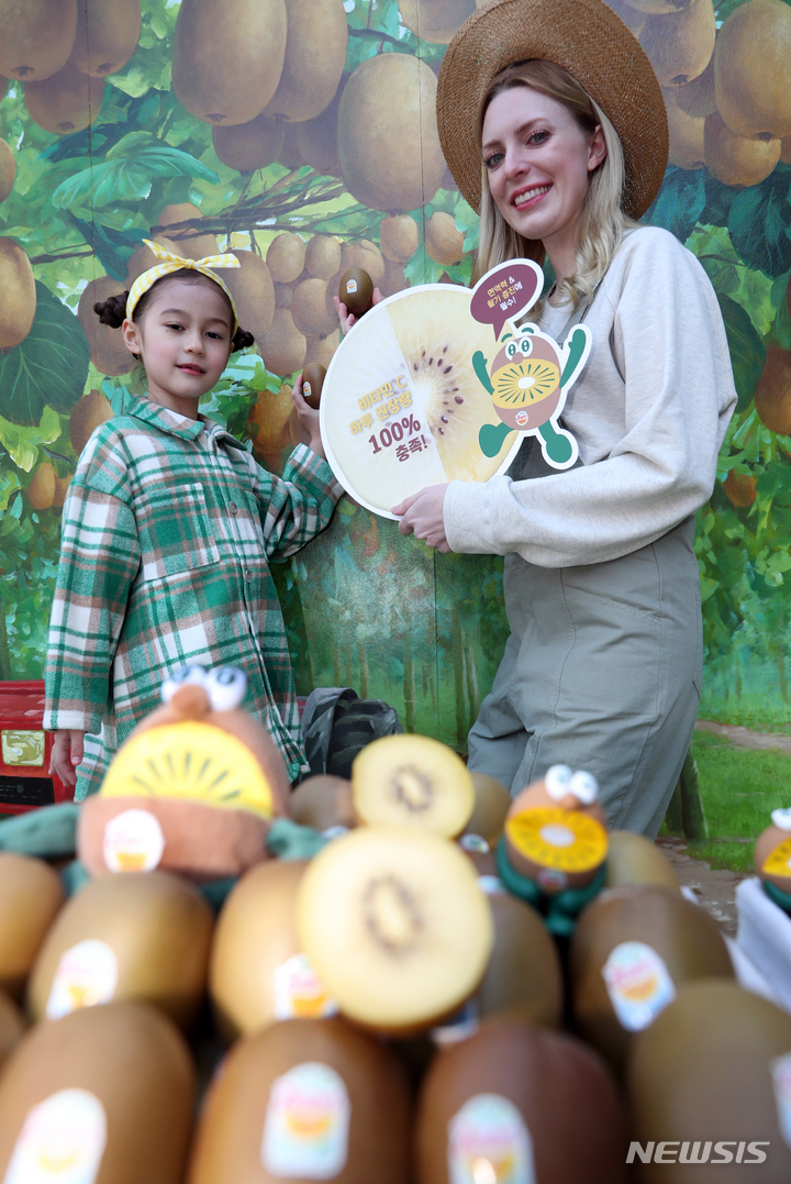 ソウル市内のプレスセンター前広場で15日、コンパニオンがポーズを取り、ゼスプリ・サンゴールドキウイの2022年初出荷をPRしている。ゼスプリ・サンゴールドキウイはビタミンCが豊富で、一日1個食べるだけでも一日の勧奨摂取量を満たし、活気あふれる日常を過ごす助けになる。