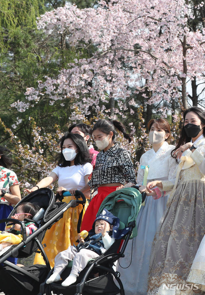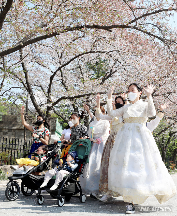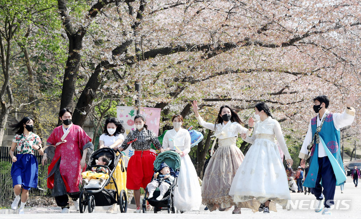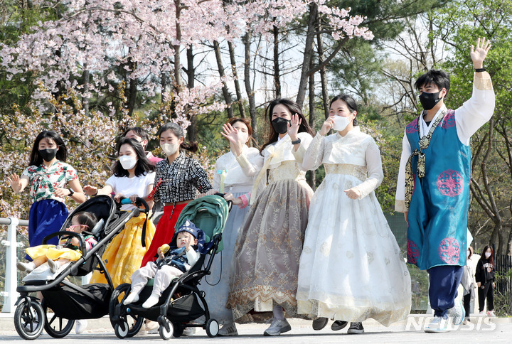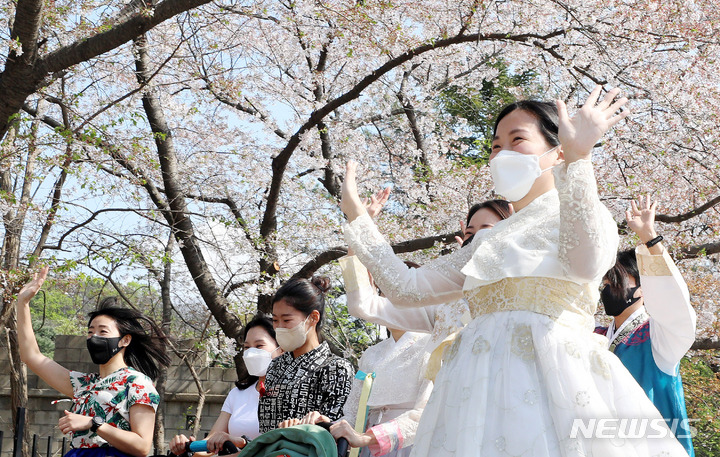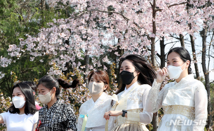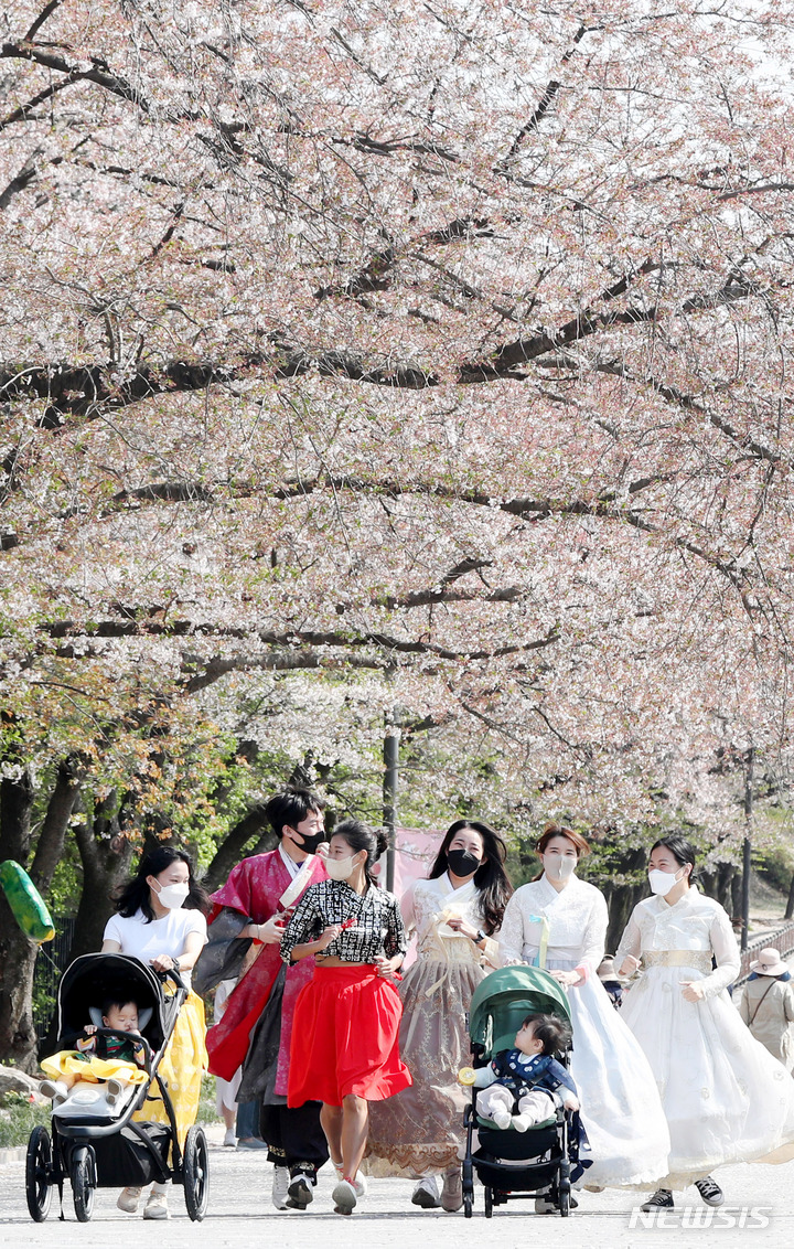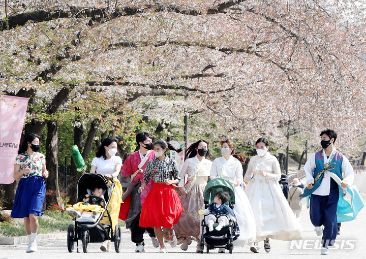 「ソウル大公園韓服マラソン」が開かれた15日午後、京畿道果川市のソウル大公園にて、韓服姿でサクラの並木道を走る参加者らの様子。
