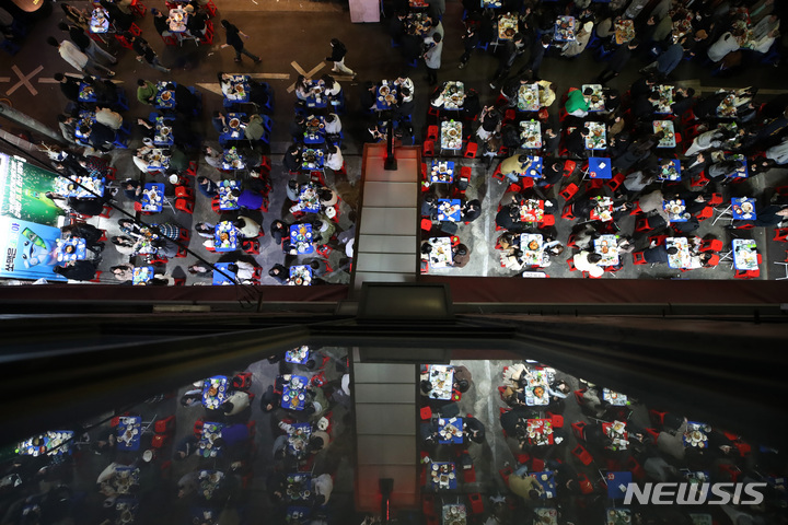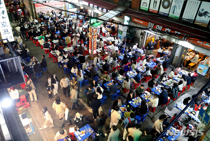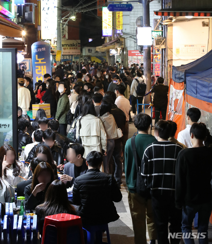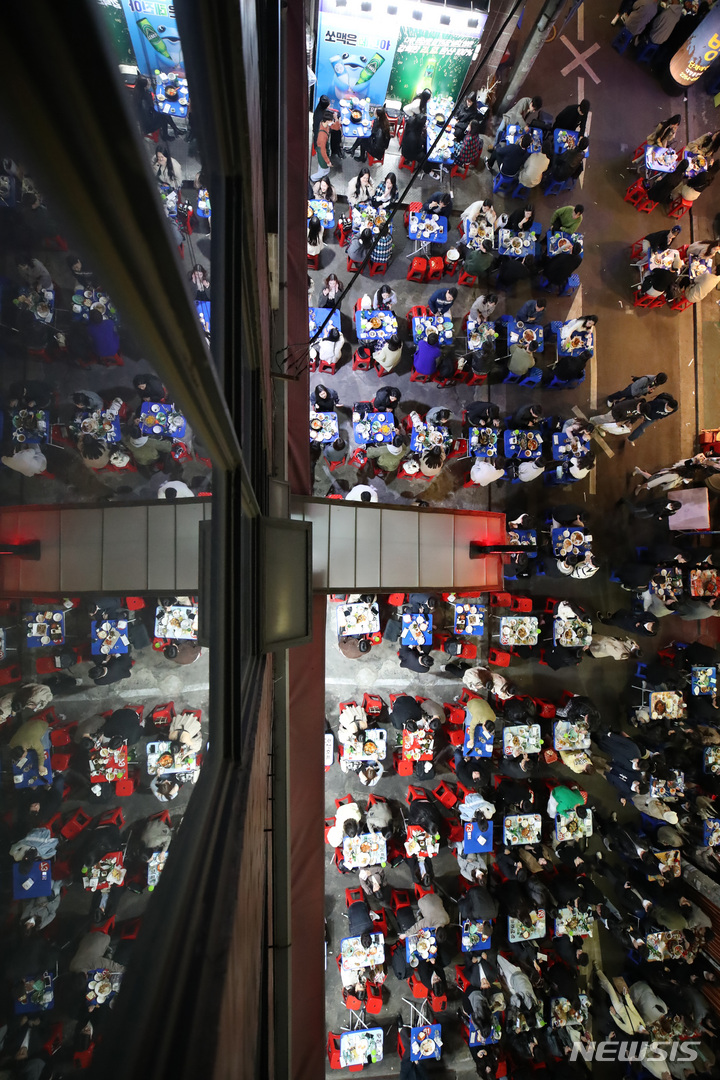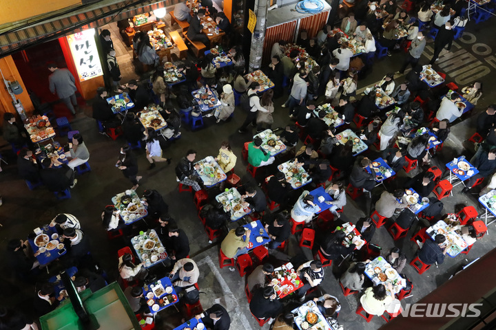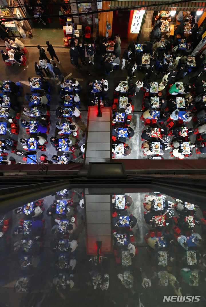 今月18日から私的な集まりの人数および営業時間制限など、新型コロナウイルス感染症拡大の影響で始まった政府によるソーシャル・ディスタンス(社会的距離)の確保が、2年1カ月ぶりに全面解除される。写真は15日午後、ソウル市中区乙支路のノガリ(スケトウダラの幼魚)横丁。多くの市民たちでにぎわっている。