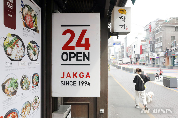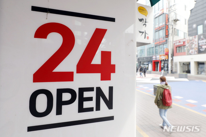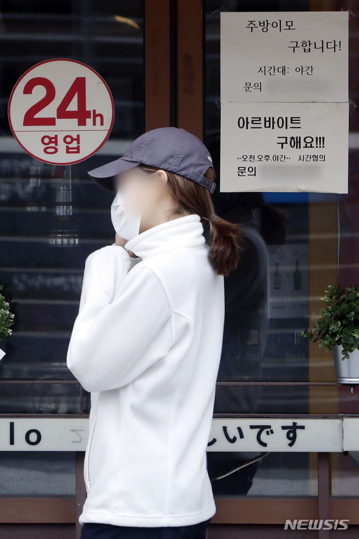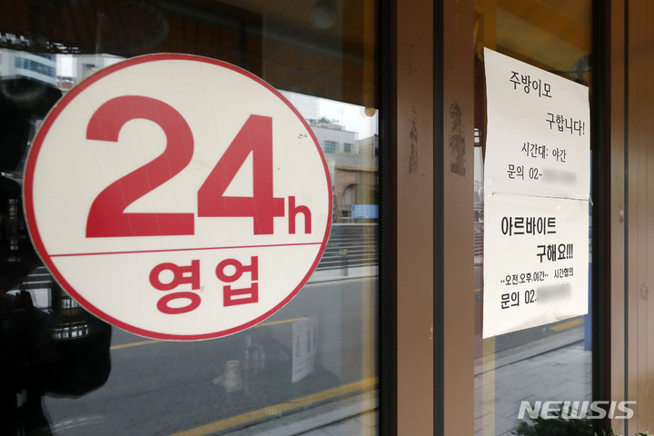 およそ2年ぶりに24時間営業が可能になった18日、ソウル市麻浦区の弘大通りの飲食店には、アルバイト募集の広告が張り出されていた。