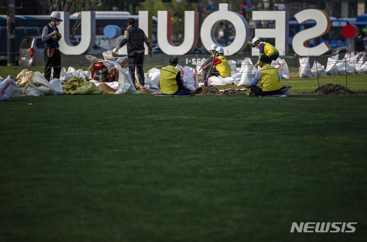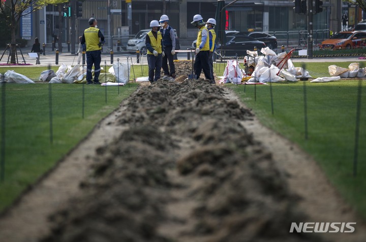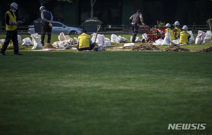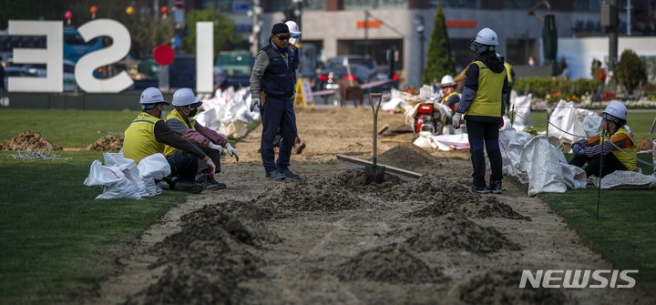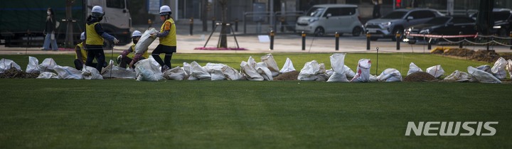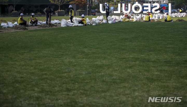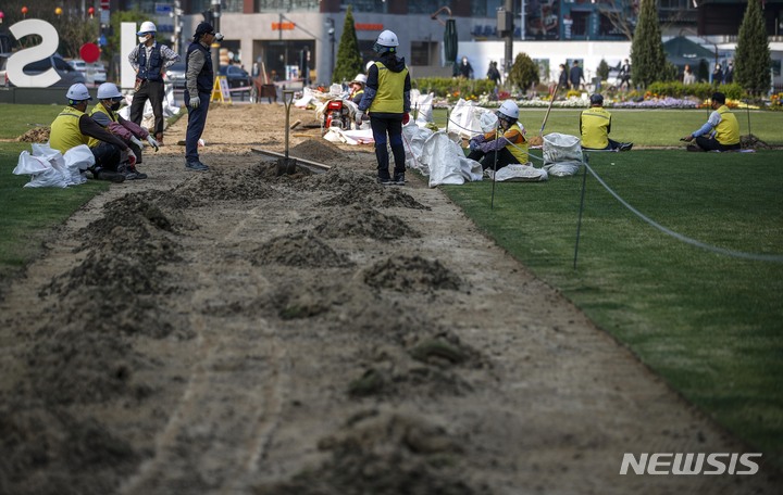 【NEWSIS】19日午前、ソウル市中区のソウル広場で、芝張り作業が行われた。