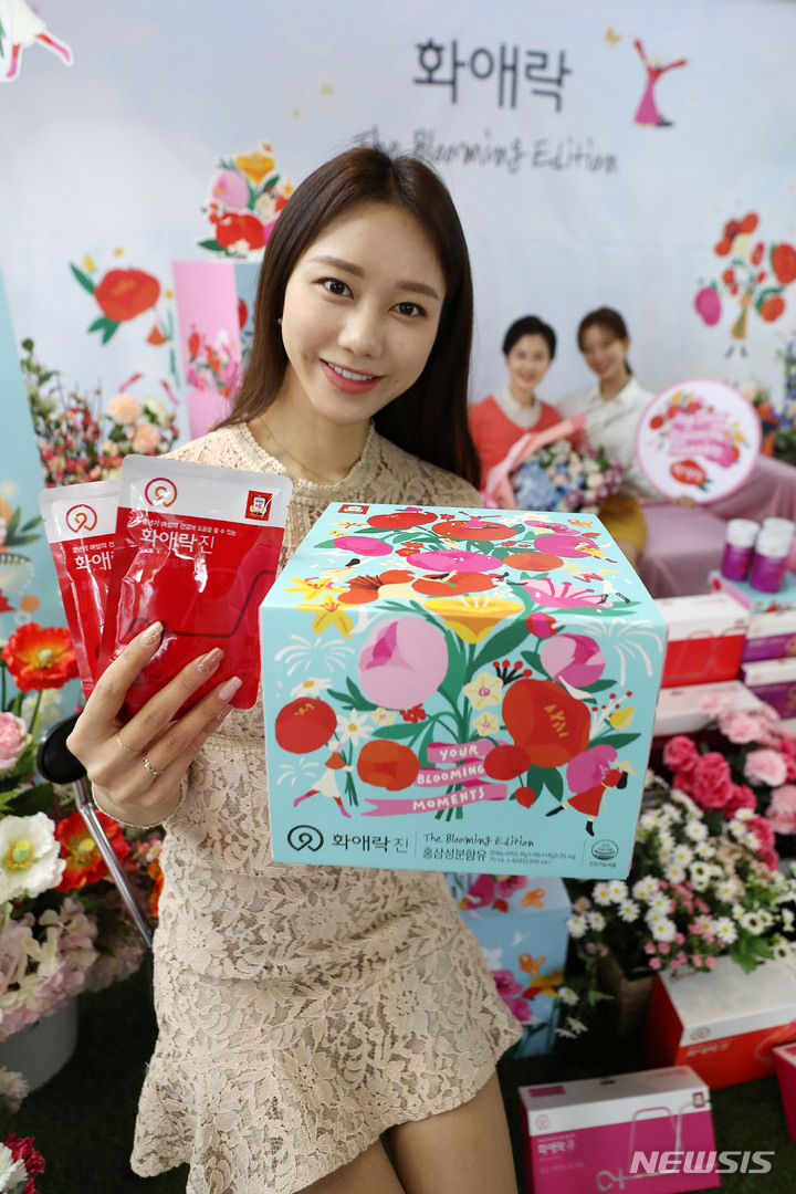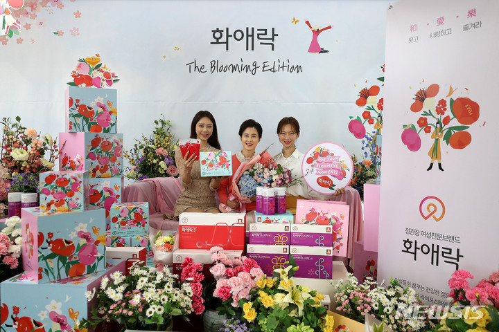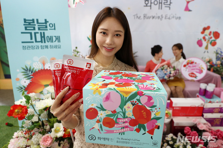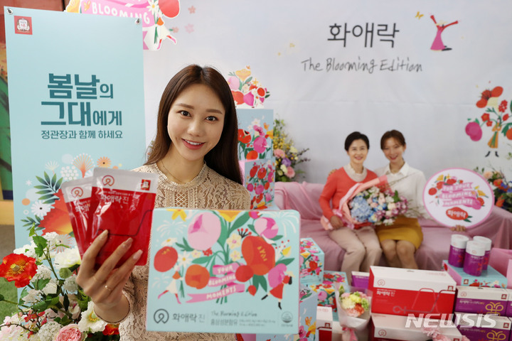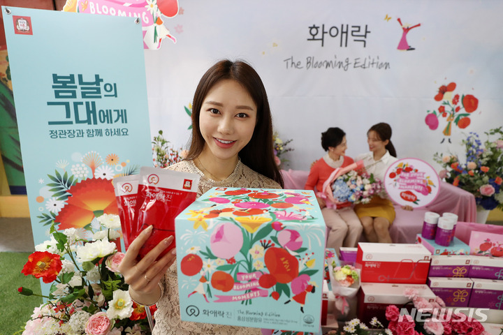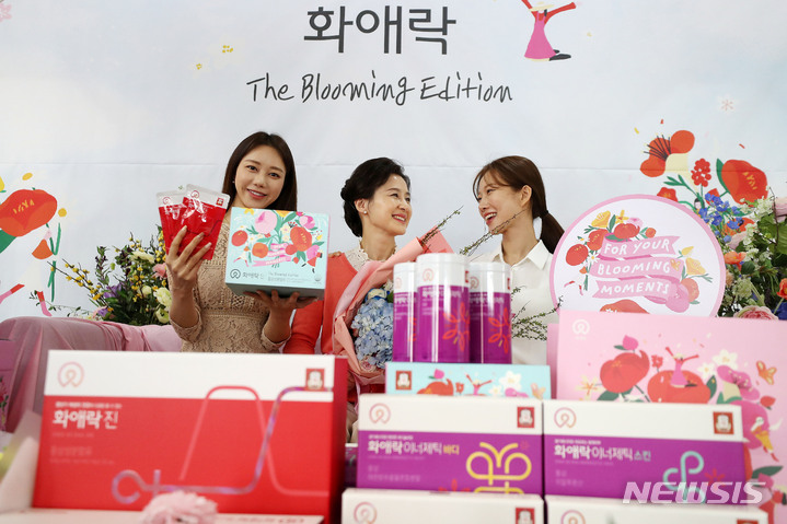 ソウル市中区忠武路のコリアハウスに設けられた「春の日のあなたへ、正官庄で気持ちを伝えましょう」写真イベントブースで21日午前、コンパニオンらが商品をPRした。
