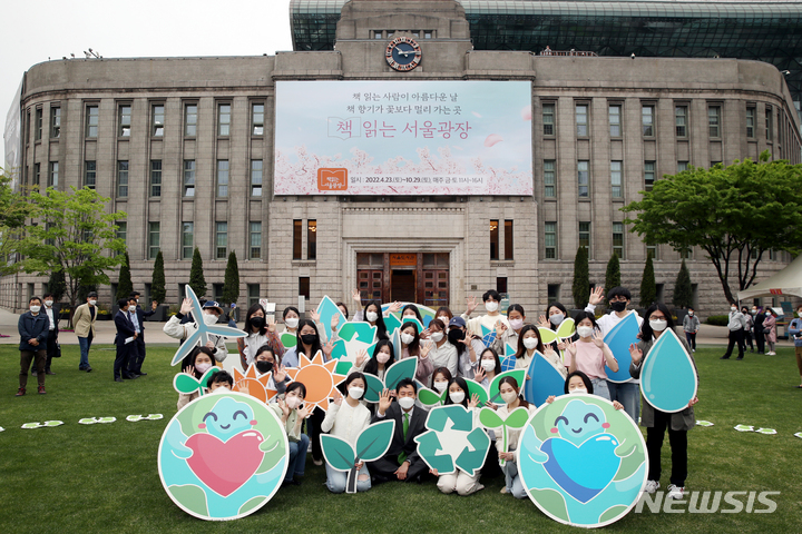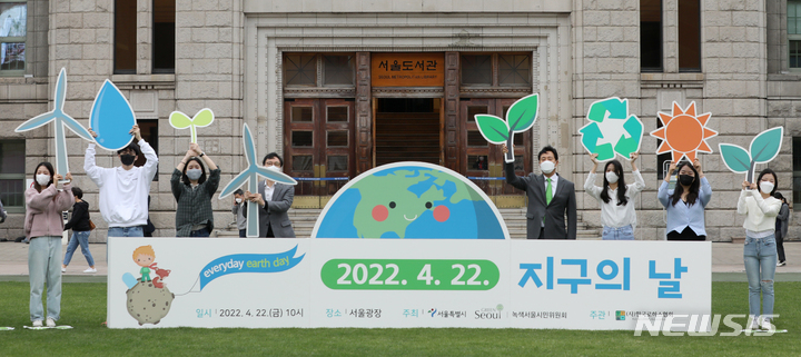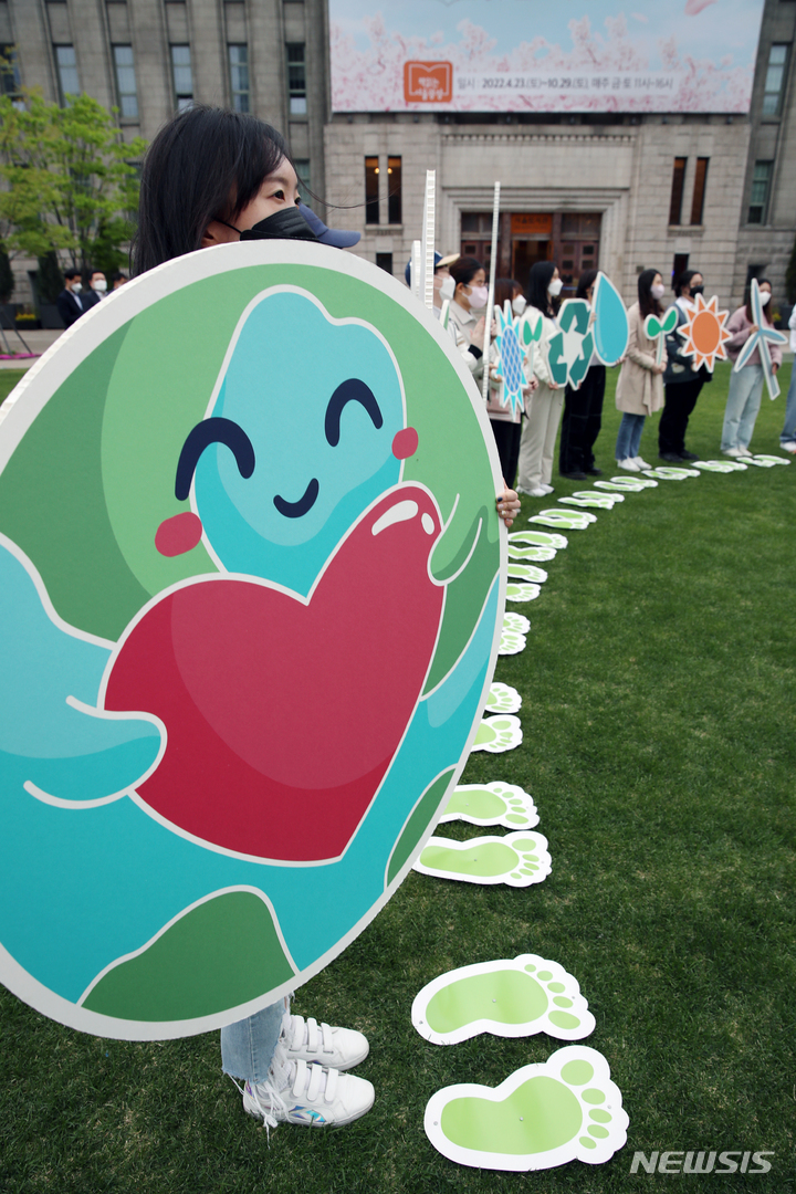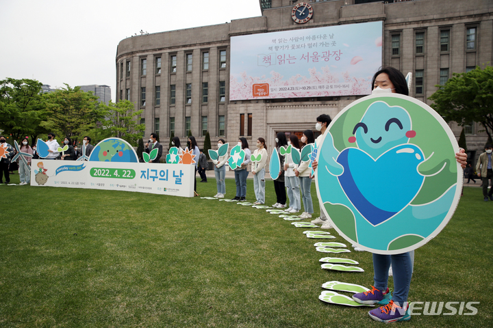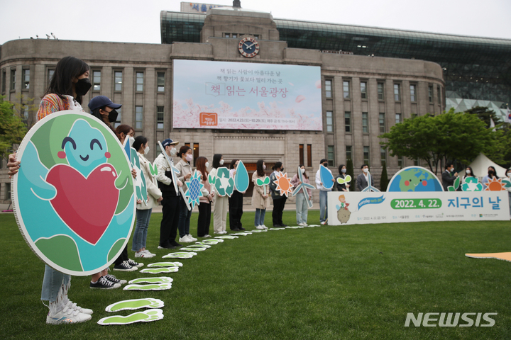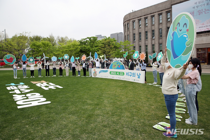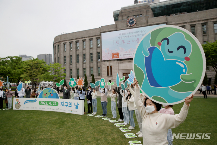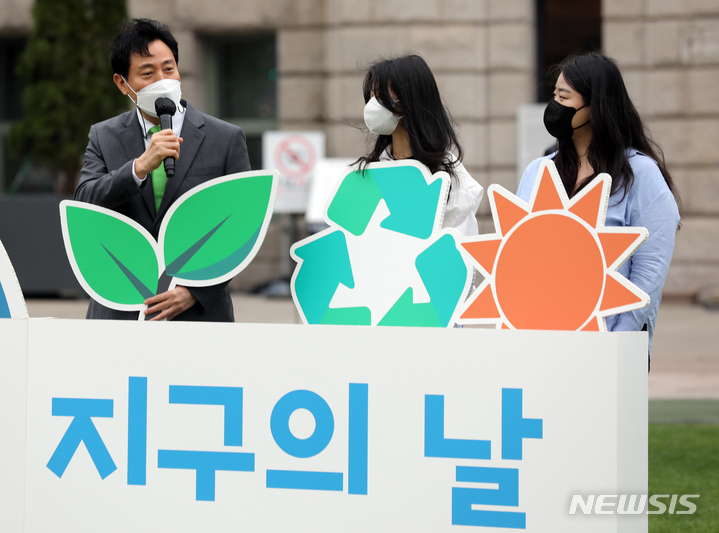 アースデイに当たる22日午前、ソウル市中区のソウル広場で開催された2022年アースデイ記念イベントで、呉世勲(オ・セフン)ソウル市長と市民たちが記念パフォーマンスを繰り広げた。