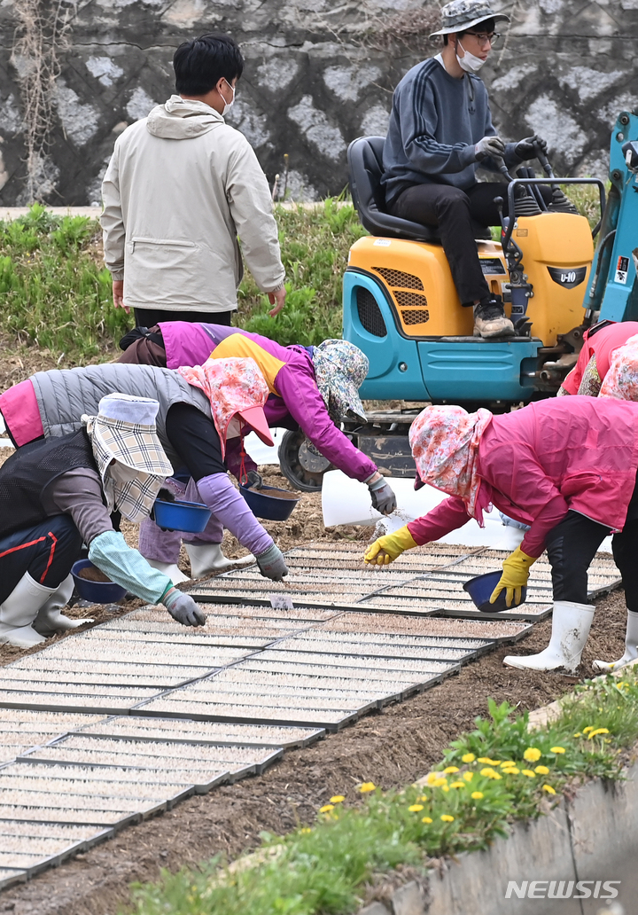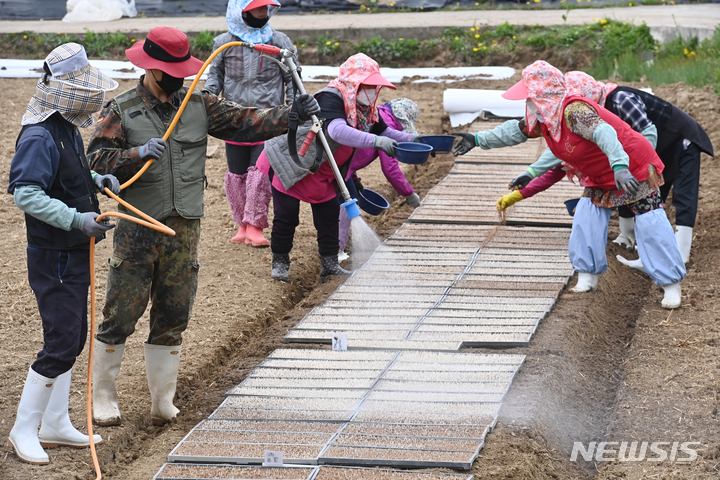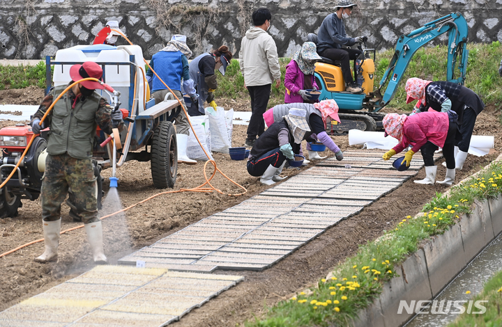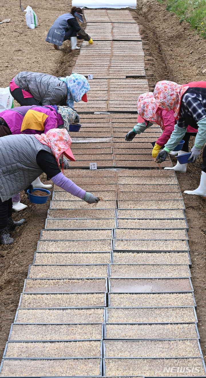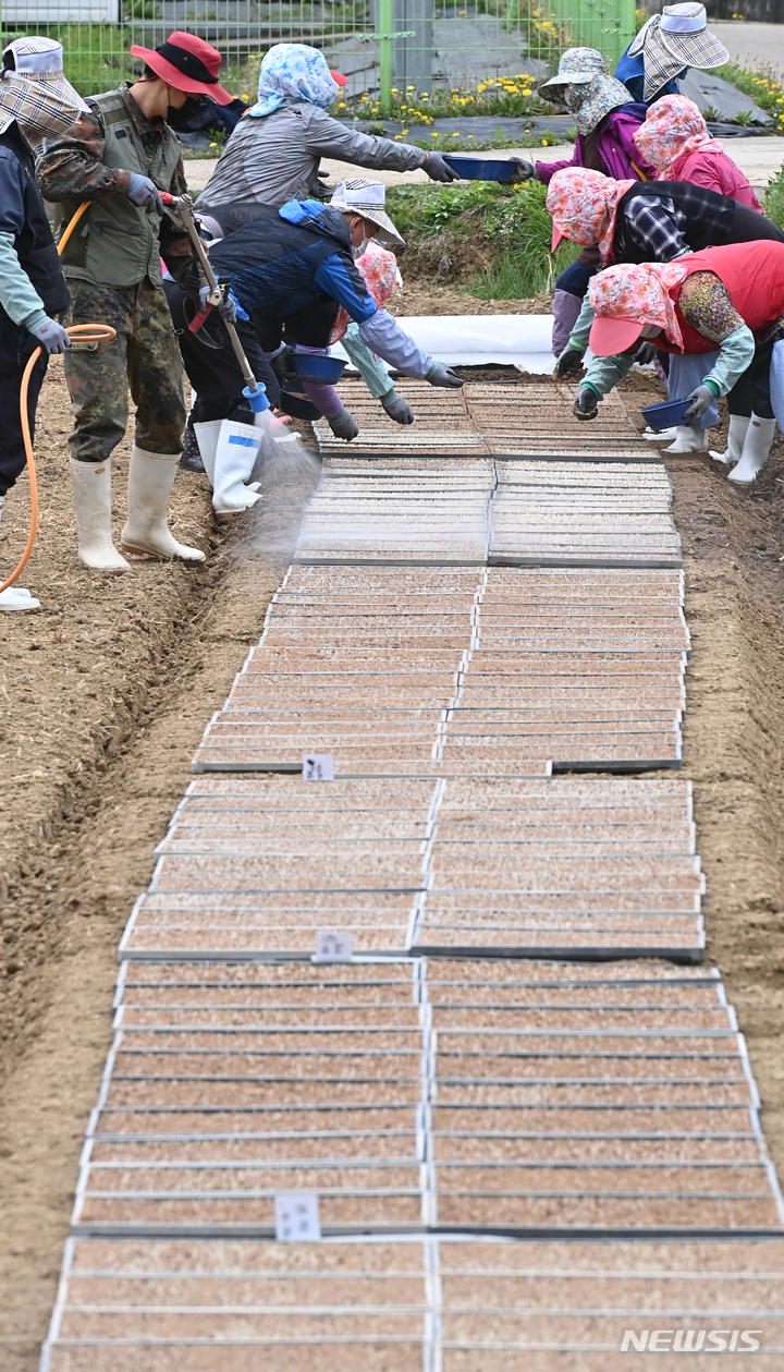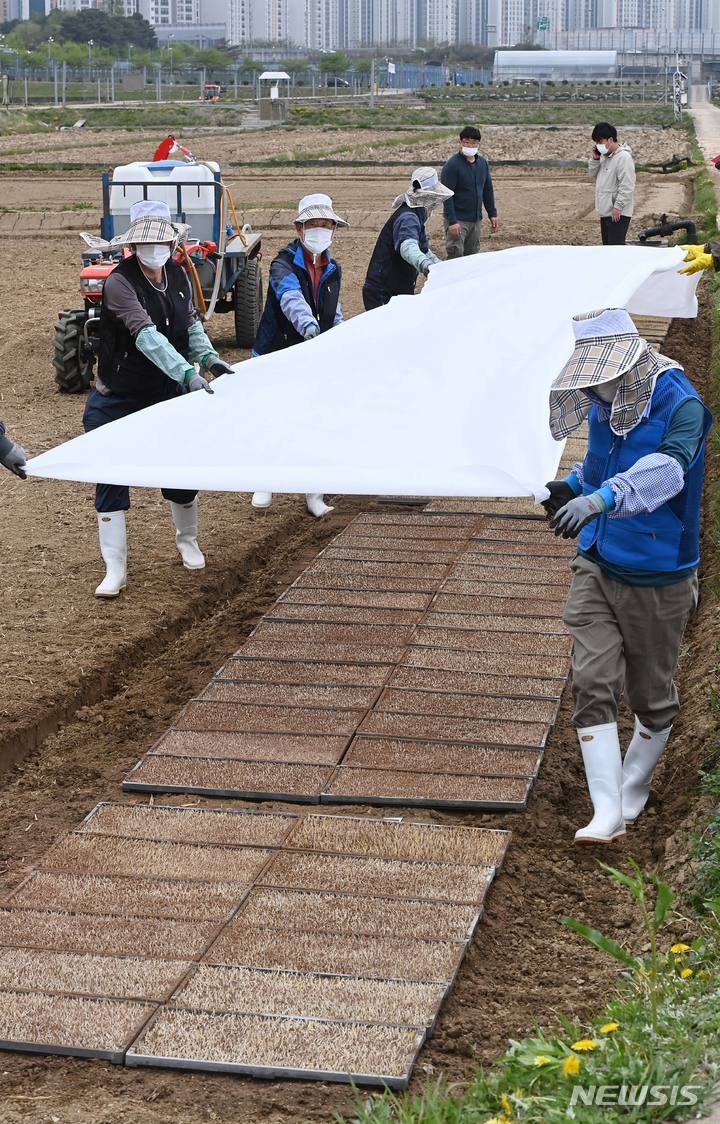 本格的な営農期を迎えた22日、京畿道華城市の京畿道農業技術院では、関係者らが研究用の育苗作業を行っていた。