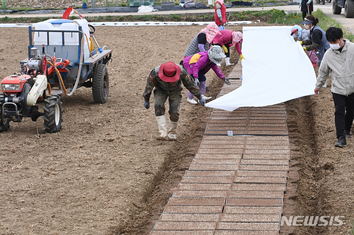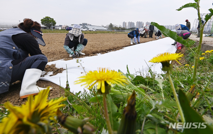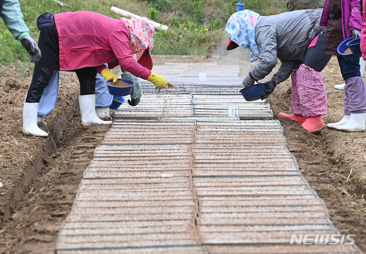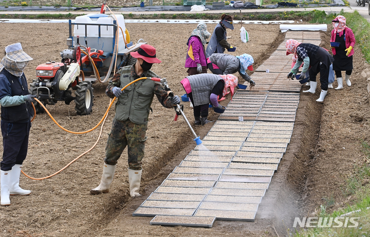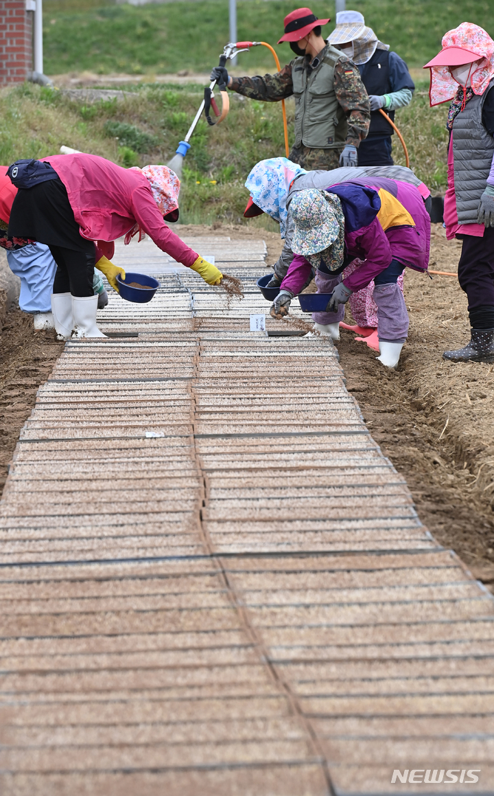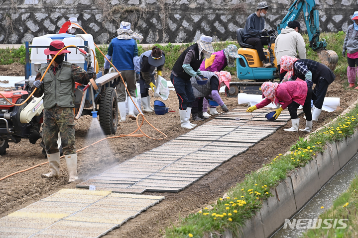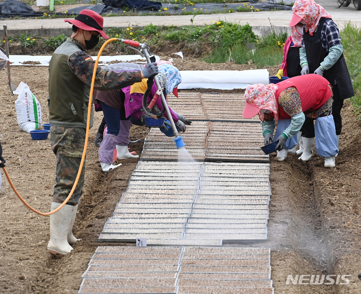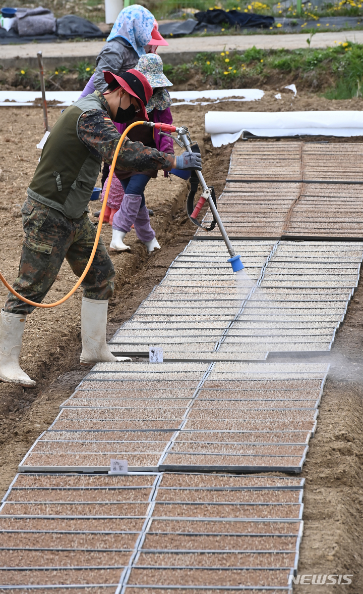 本格的な営農期を迎えた22日、京畿道華城市の京畿道農業技術院では、関係者らが研究用の育苗作業を行っていた。