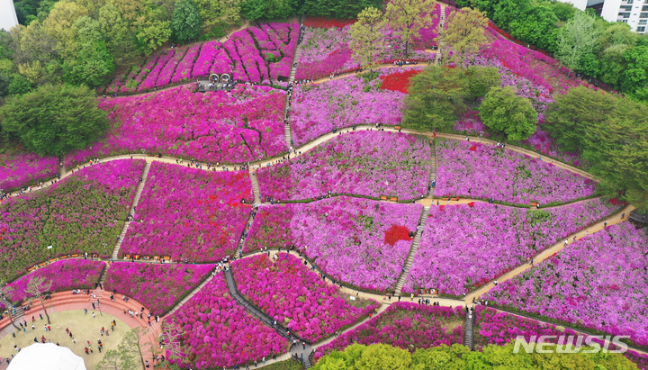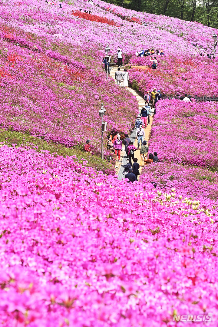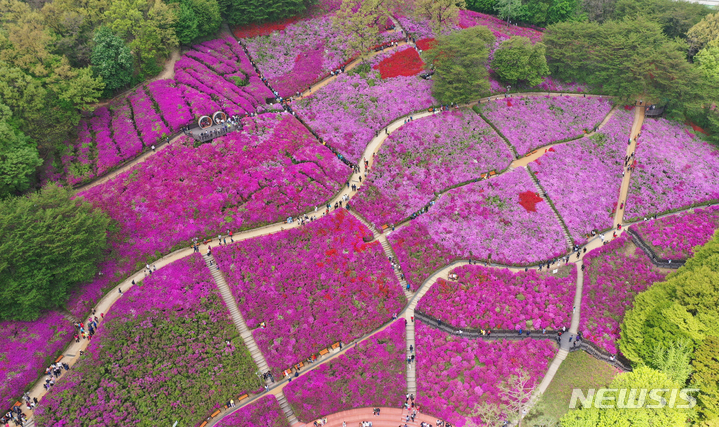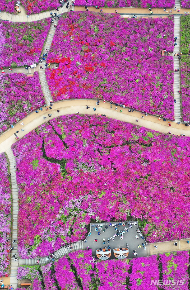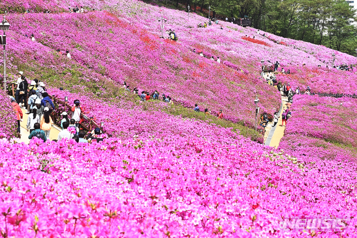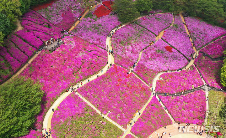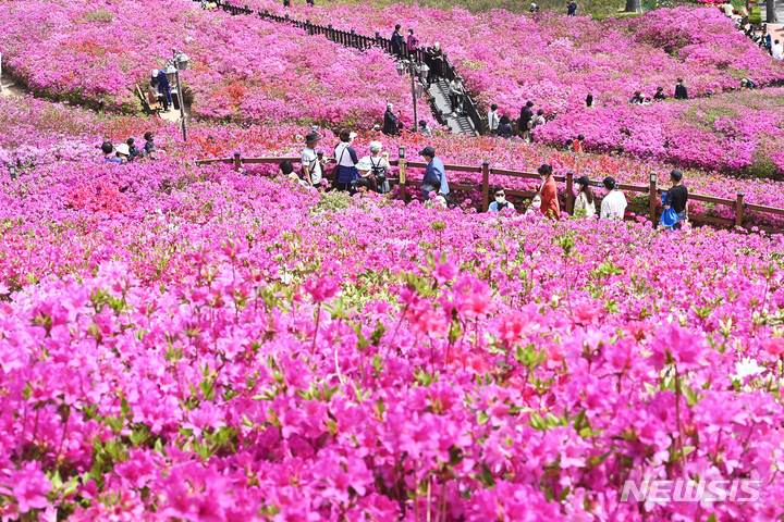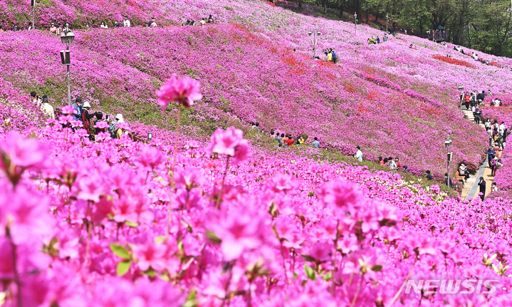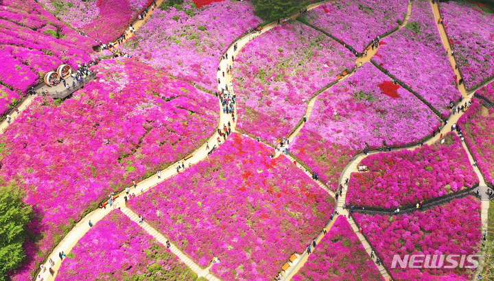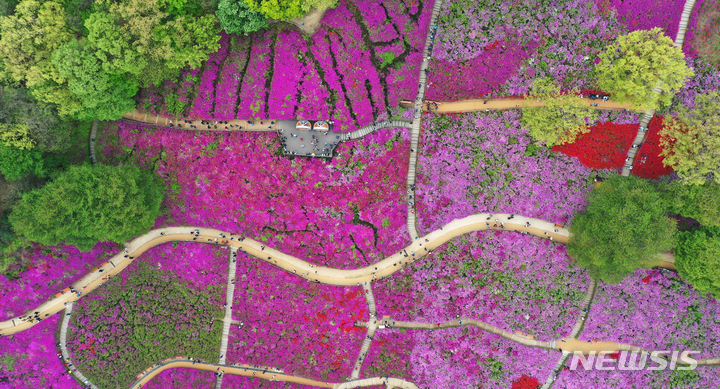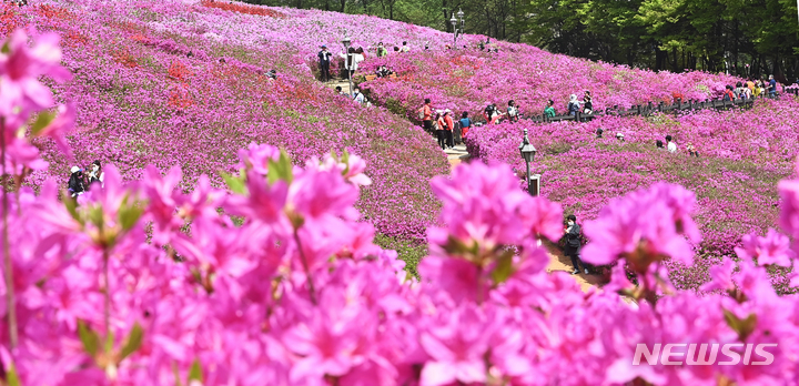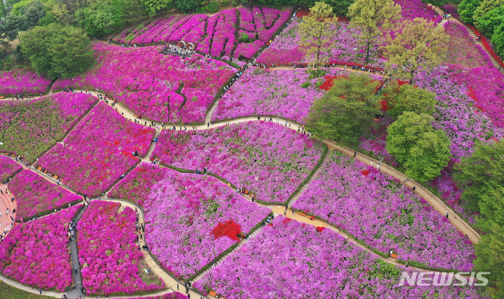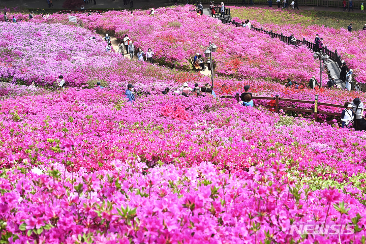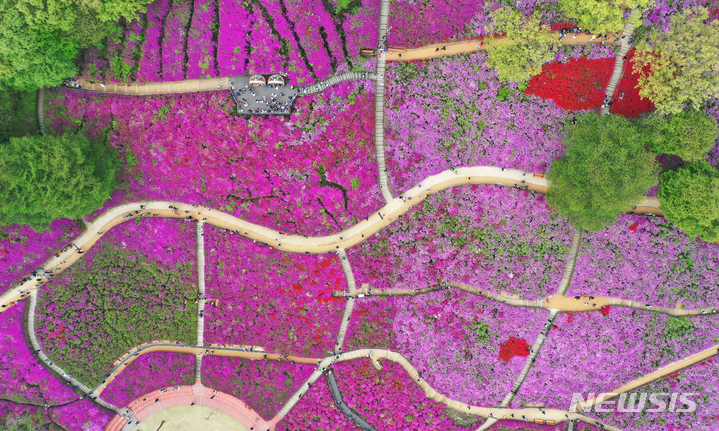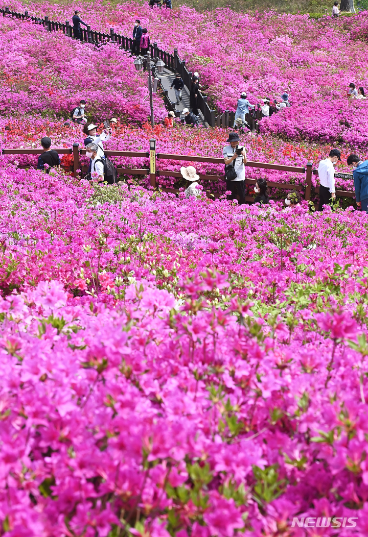 【NEWSIS】新型コロナウイルス感染症の防疫措置が全面解除されて初の週末を迎えた24日、京畿道軍浦市山本洞にあるツツジの丘を訪れた人々。満開のツツジを見て春を満喫している。新型コロナ流行の長期化でこの2年間閉鎖されていた軍浦のツツジの丘は来月8日まで開放される予定だ。