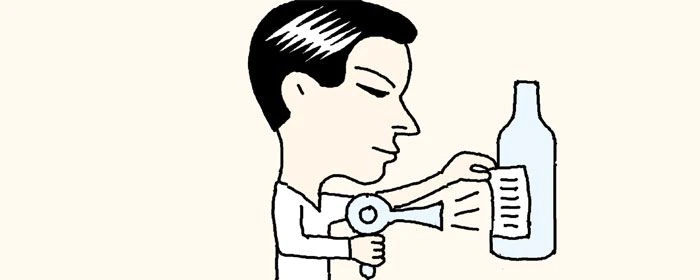 ガラス瓶に貼られているラベルは、角を少しはがしてからドライヤーの熱風をあてれば、接着剤が溶けて楽にはがせるようになる。