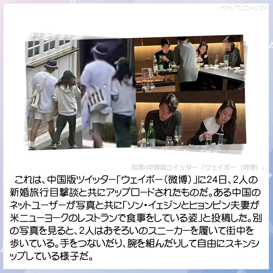 新婚旅行中の俳優ヒョンビン(39)=本名:キム・テピョン=と女優ソン・イェジン(40)=本名:ソン・オンジン=夫妻の目撃写真が公開された。これは、中国版ツイッター「ウェイボー(微博)」に24日、2人の新婚旅行目撃談と共にアップロードされたものだ。ある中国のネットユーザーが写真と共に...