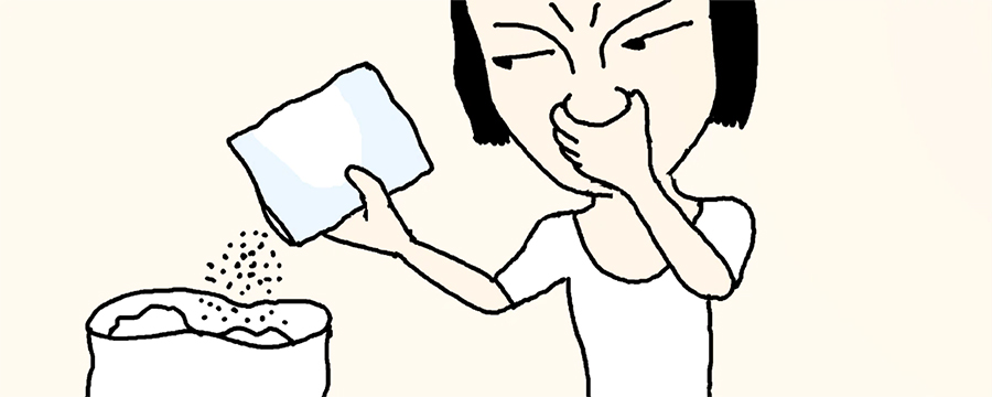 ゴミ袋やゴミ箱から出るにおいが気になる時は、重曹をゴミの上にまいておくと、ある程度抑えられる。
