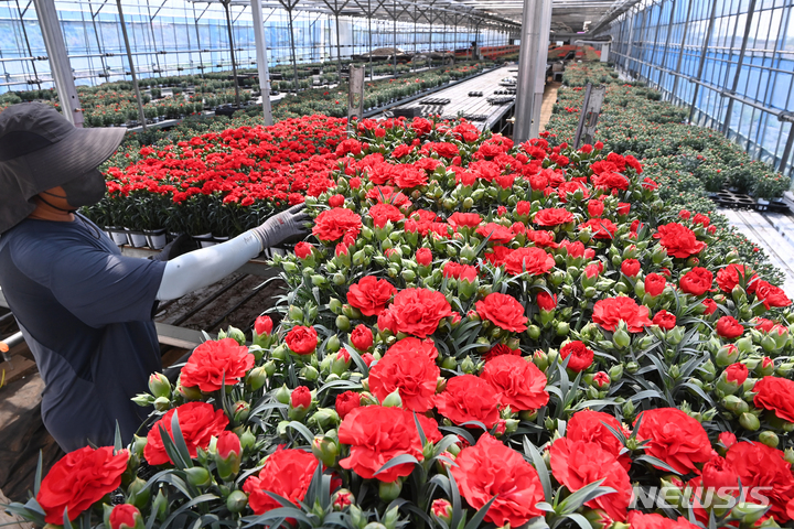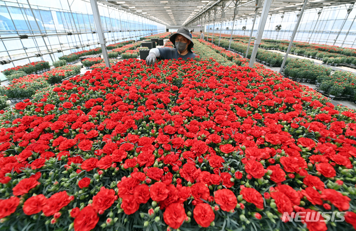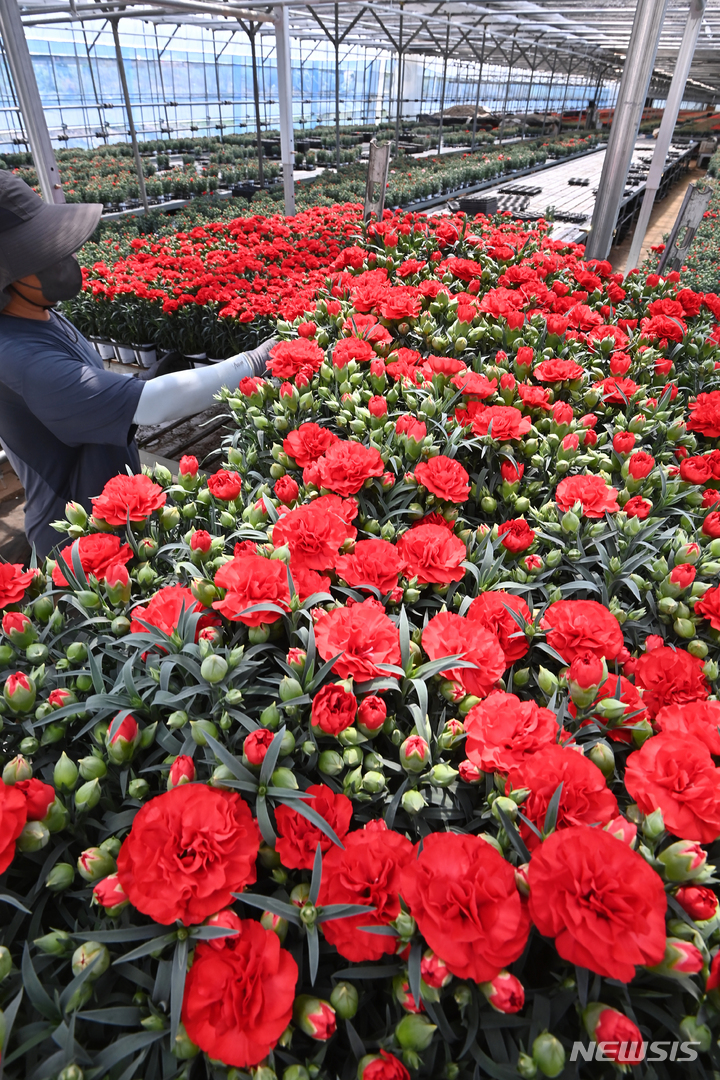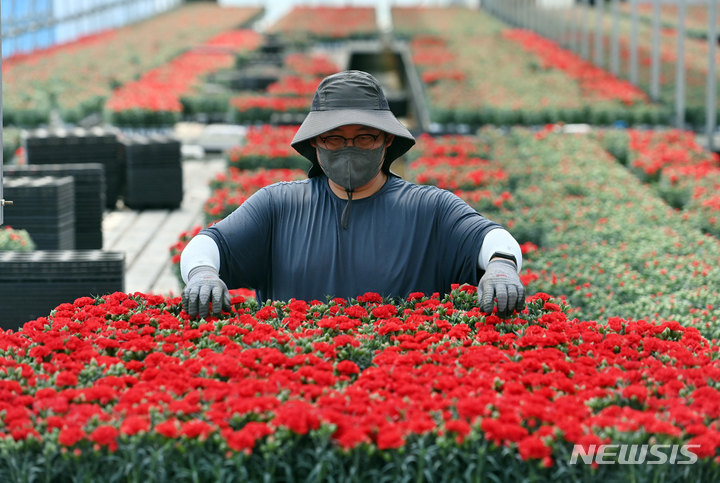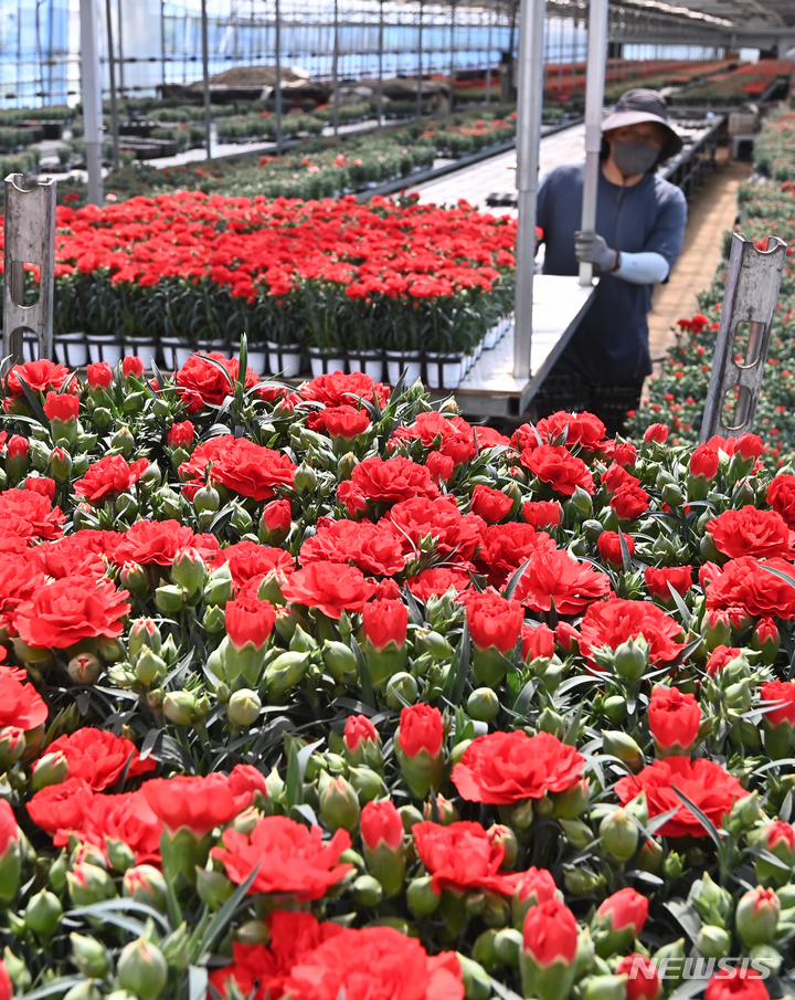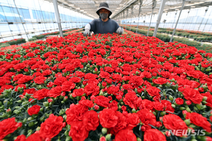 5月の父母の日(5月8日)、先生の日(5月15日)など、カーネーションの需要が増える時期を控え、京畿道平沢市の花き農家では27日午後、農民がカーネーションの出荷のため忙しそうに作業していた。花き農家では、家庭の月(5月)を迎えるに当たり、新型コロナウイルス感染症の影響による厳しい状況が緩和されるのではないかと期待している。