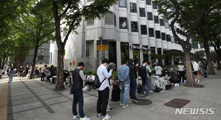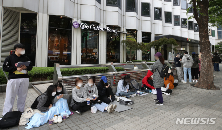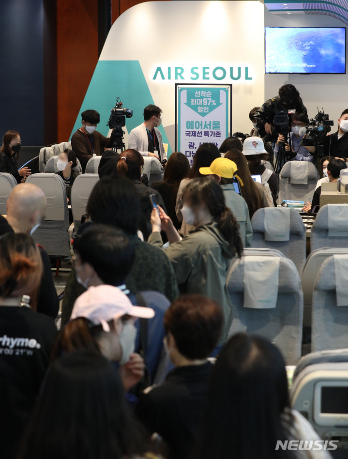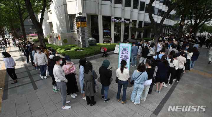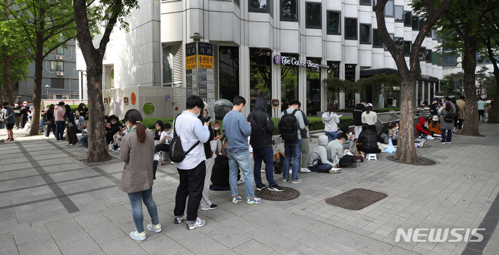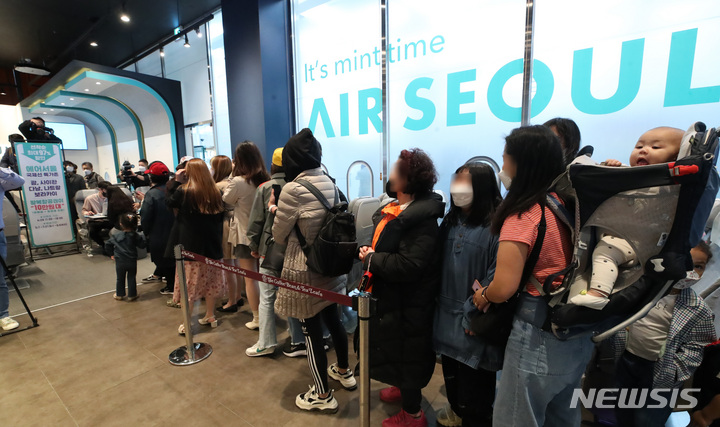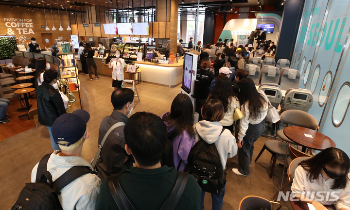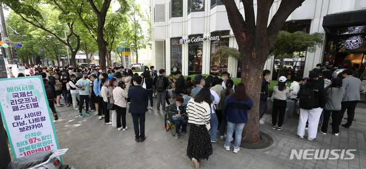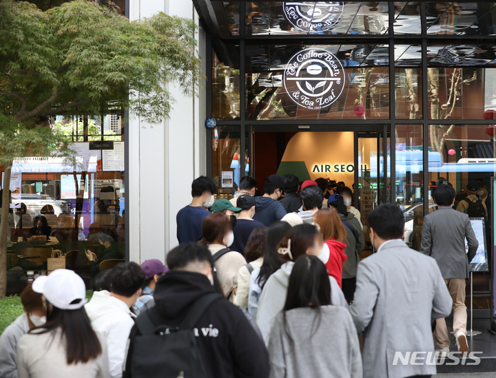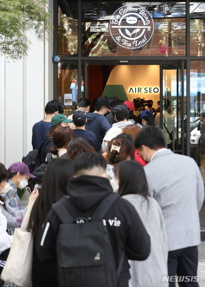 28日午前、ソウル市鍾路区のコーヒーチェーン店「The Coffee Bean&Tea Leaf」光化門店で、エアソウル国際線リオープニングフェスティバルが開催された。写真は、先着順で1000人がグアム、サイパン、ダナン、ニャチャン、ボラカイ往復航空券を10万ウォン(約1万200円)台で購入することができる97%割引券を手に入れるため、長い列をつくって待っている市民たち。一番早い人は午前3時に到着し、午前11時から始まったイベントに参加した。