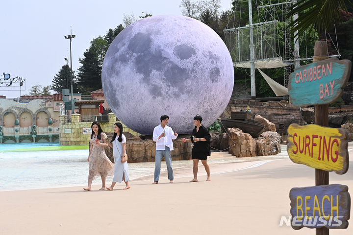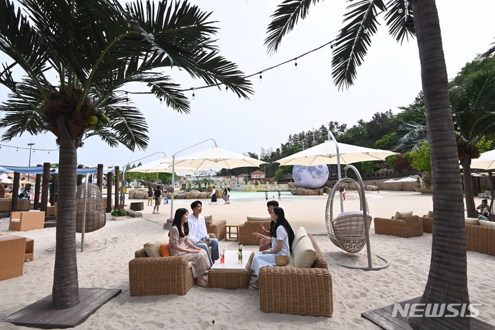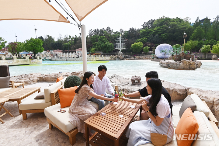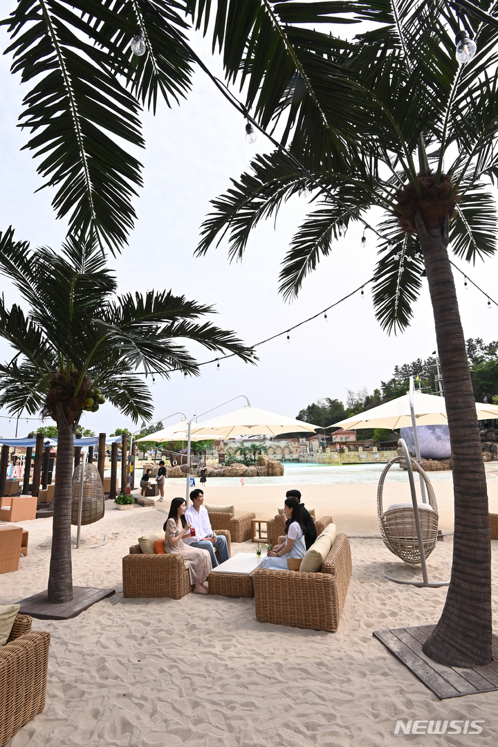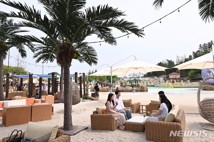28日午後、京畿道竜仁市のカリビアンベイのビーチカフェ「マール・カリブ(Mar Caribe)」では、訪れた人々が飲み物を手に楽しいひとときを過ごしていた。
