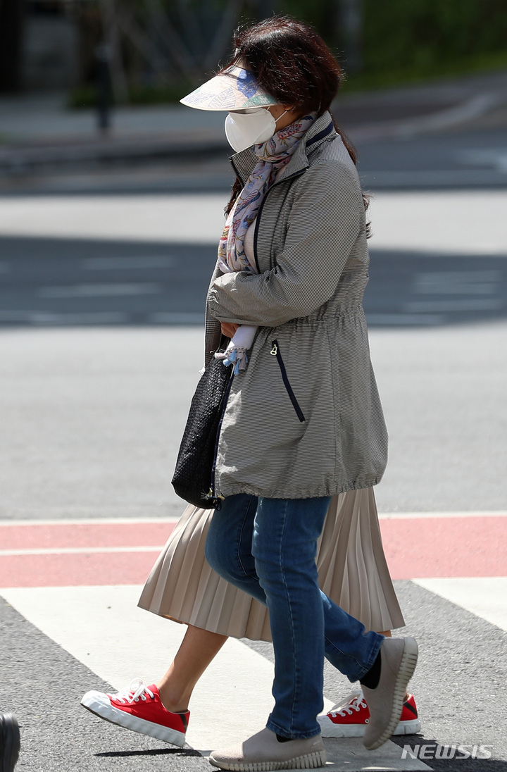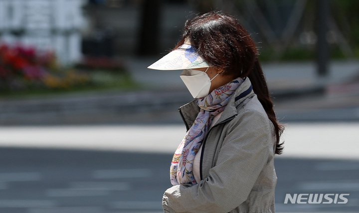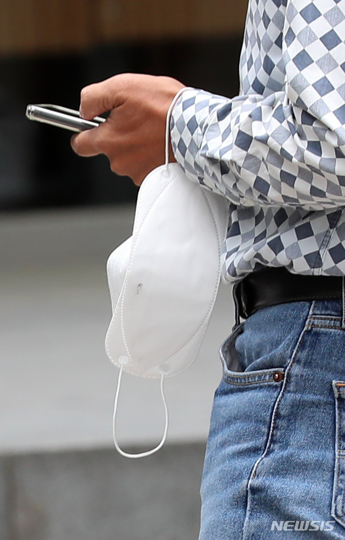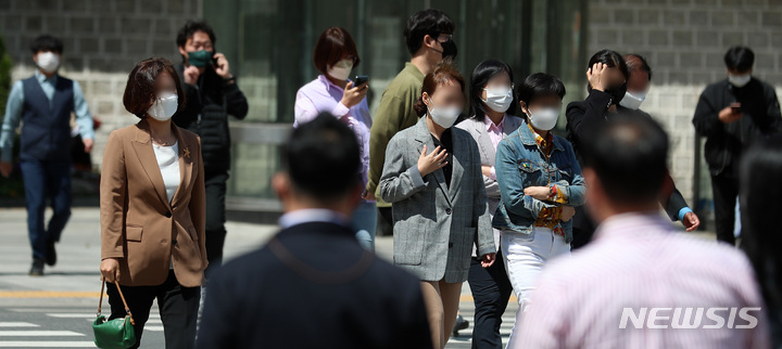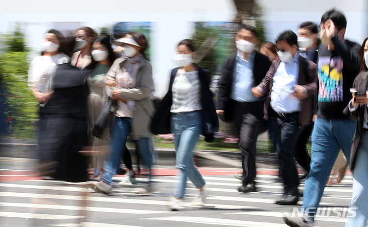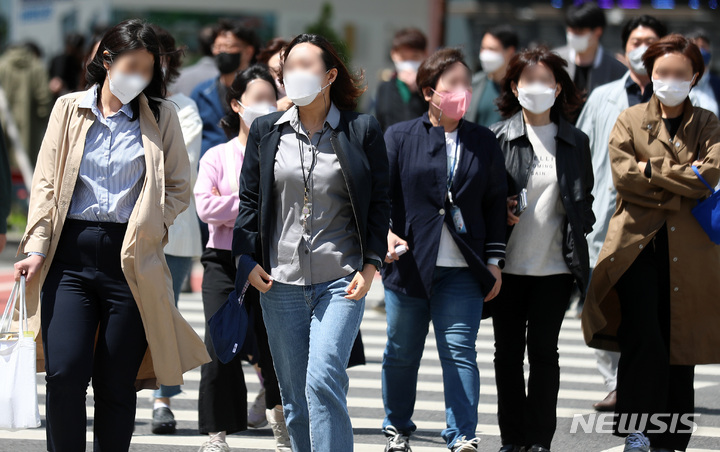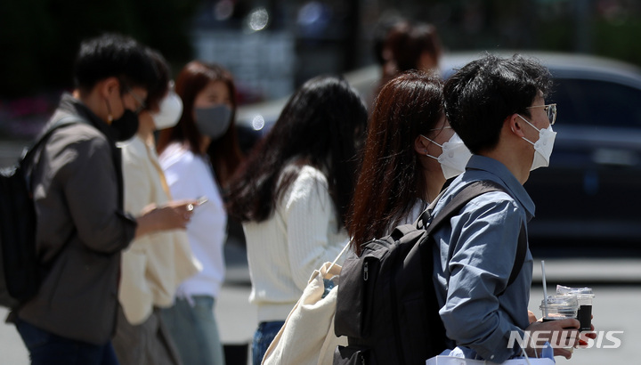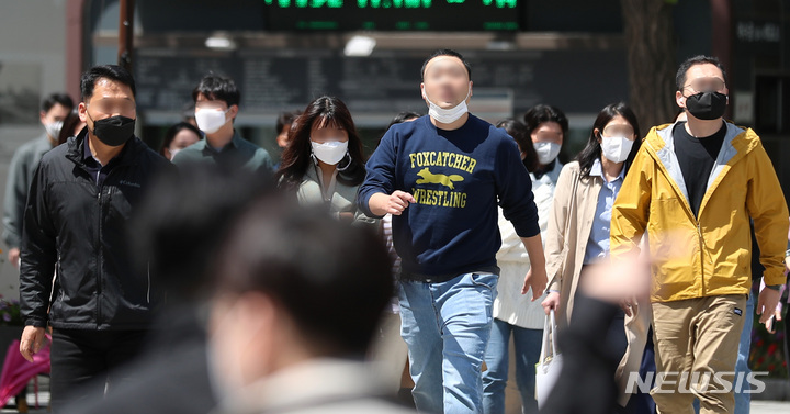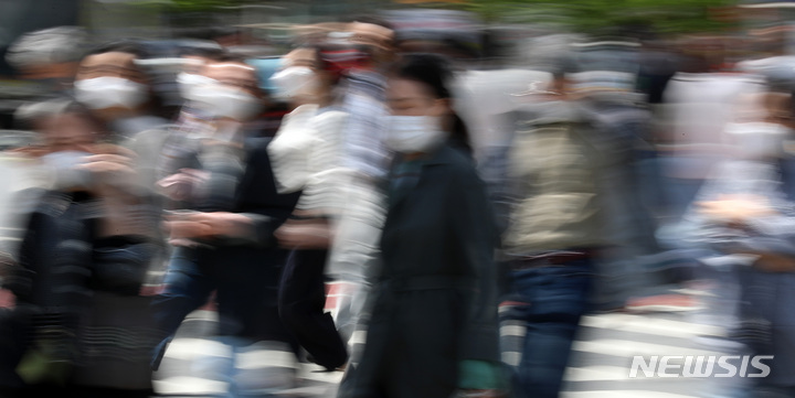 29日午後、マスクを着けてソウル都心を行き交う市民の様子。中央災難安全対策本部(中対本)は同日、屋外でのマスク着用義務化原則を来月2日から解除すると発表した。