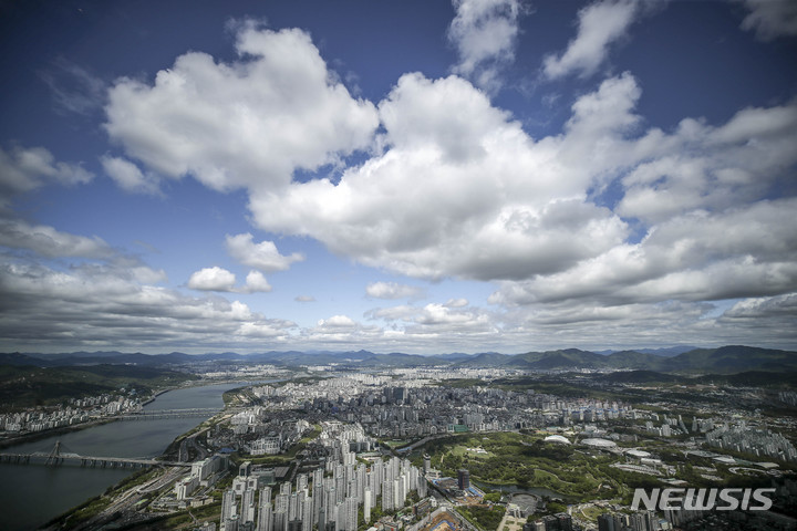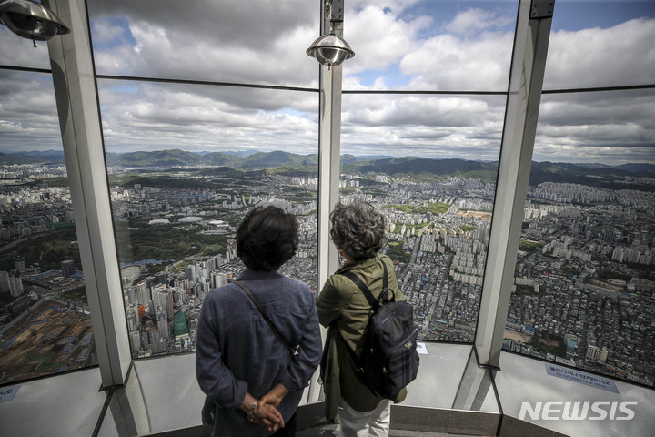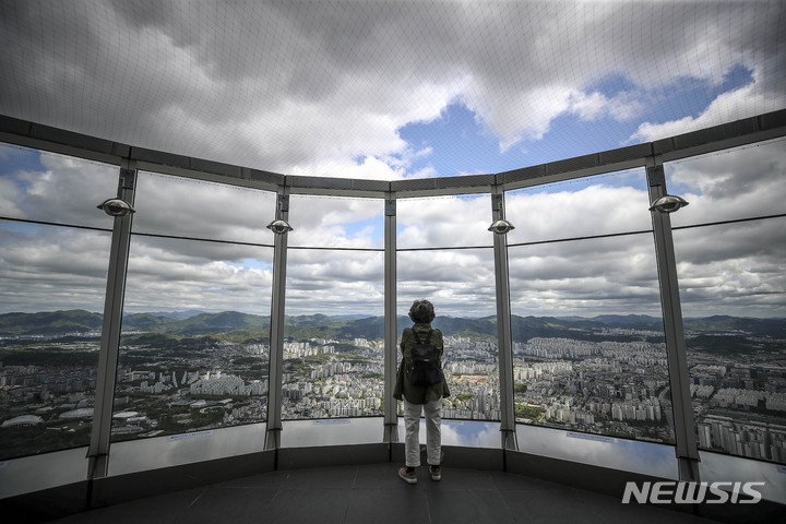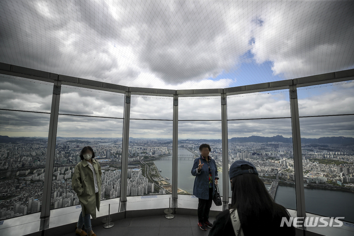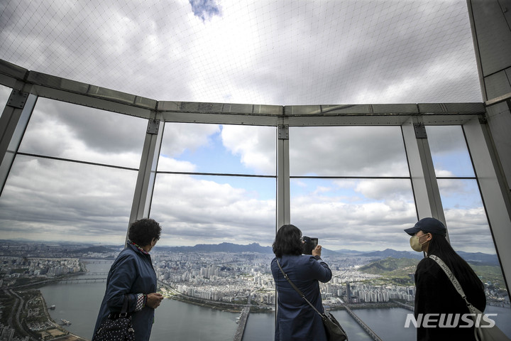 雨が止んだ29日午後、ソウル市松坡区のロッテワールドタワー展望台「ソウル・スカイ」では、訪れた市民が楽しいひとときを過ごしていた。