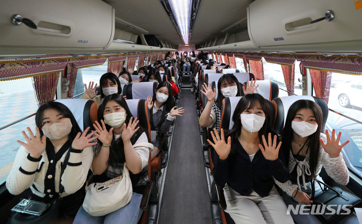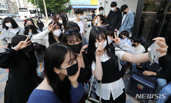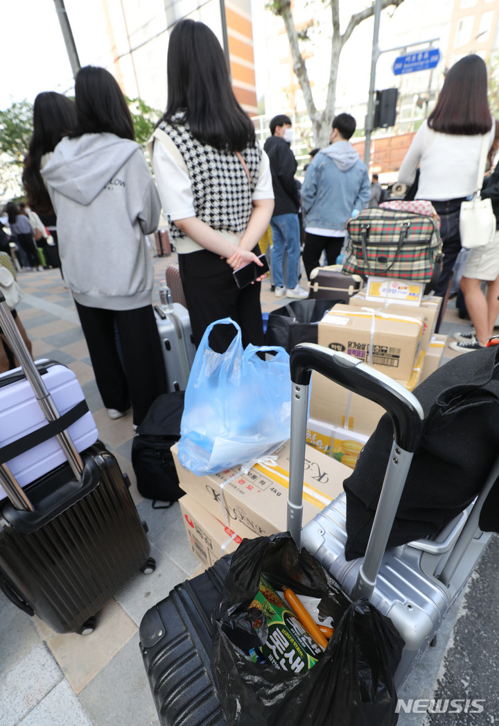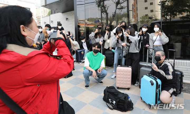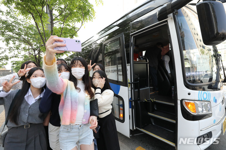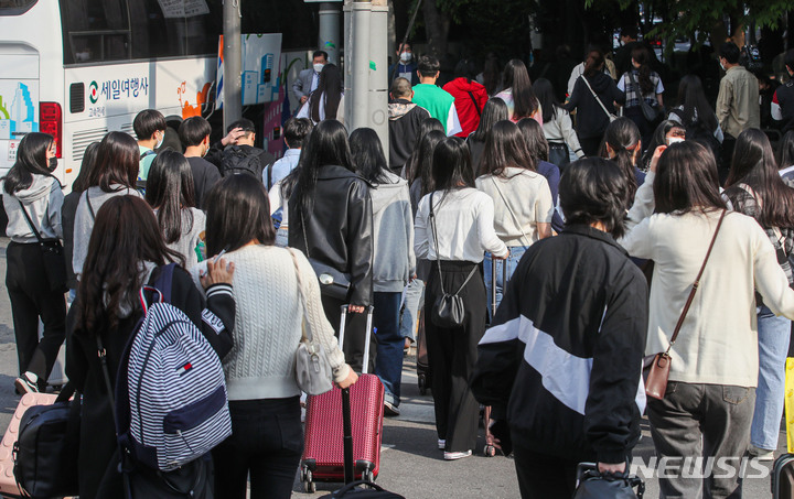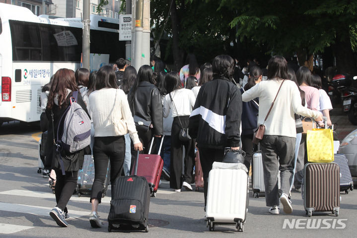 ソウル市恩平区善正国際観光高校近くでは2日午前、修学旅行に出掛けるためスーツケースを持って登校する生徒たちの姿が見られた。