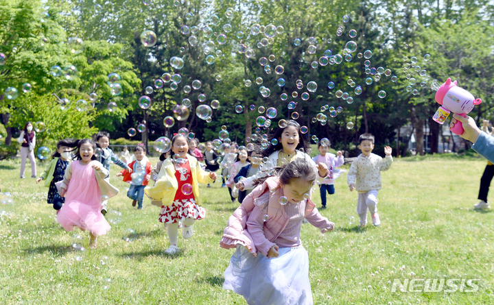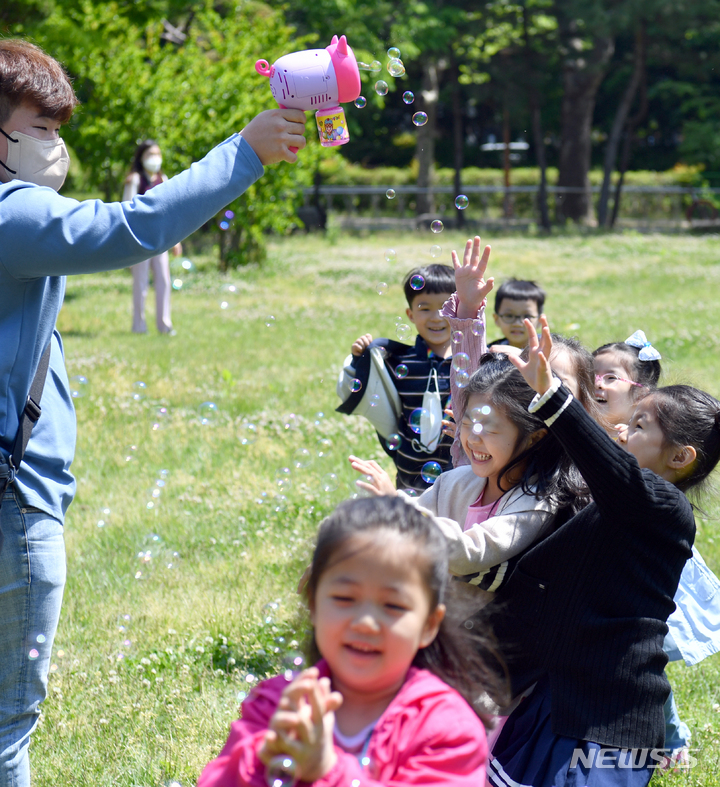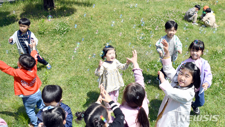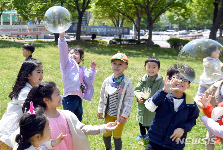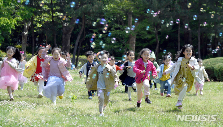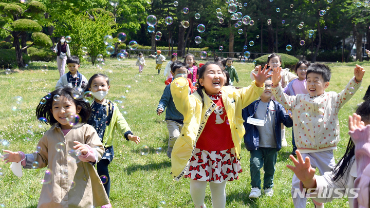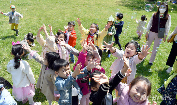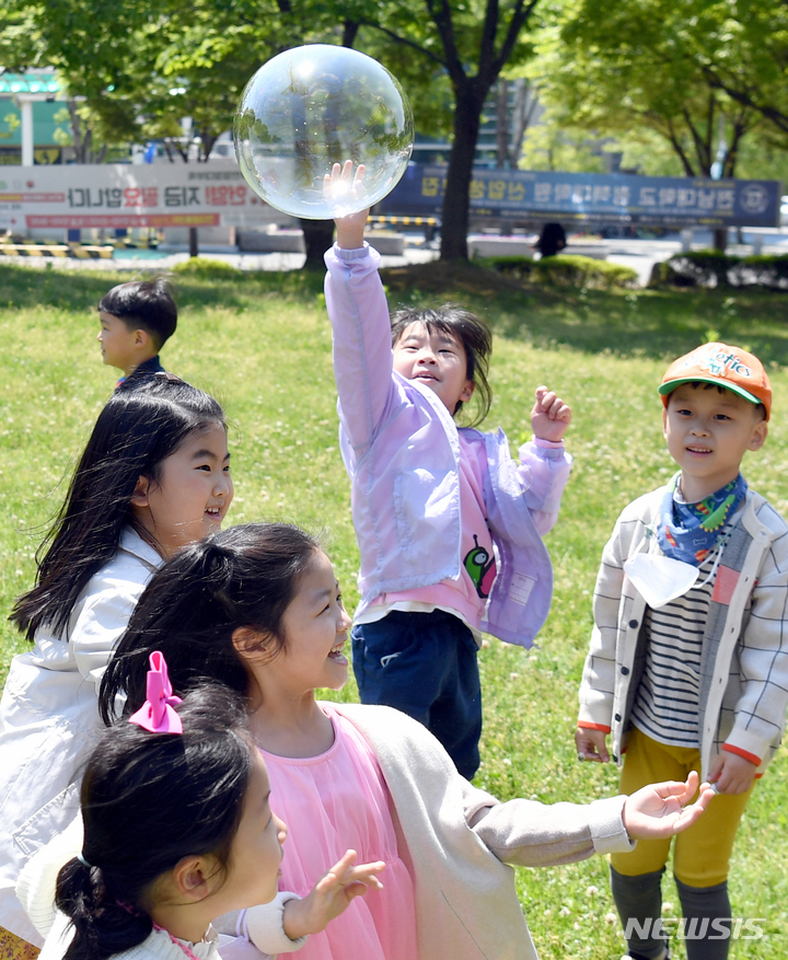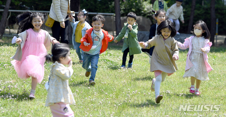 第100回「子どもの日」まであと二日と迫った3日午前、全南大学(光州市北区)裏門の芝生広場で、北区庁併設のオリニチプ(保育施設)の園児らがマスクを外し、屋外で活動している様子。