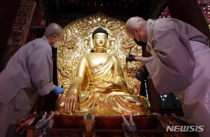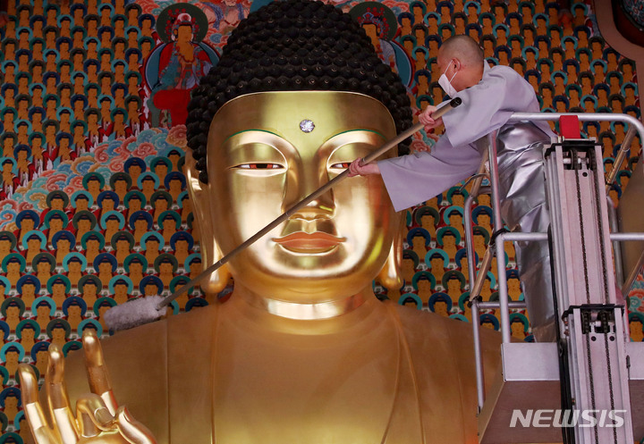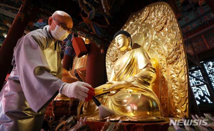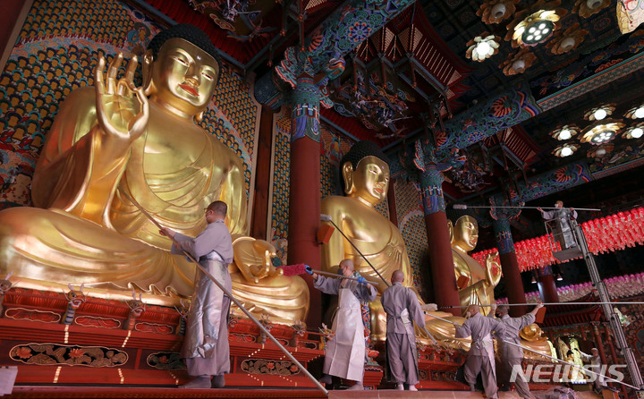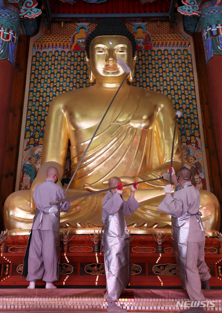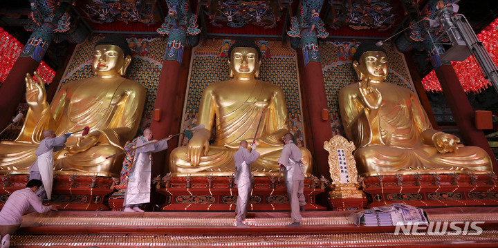 ソウル市中区の曹渓寺大雄殿で4日、僧侶らが掃除灌浴儀式を行っている様子。
