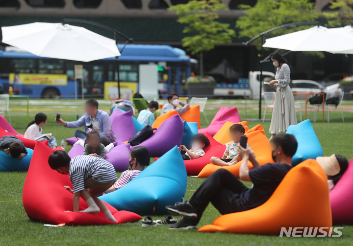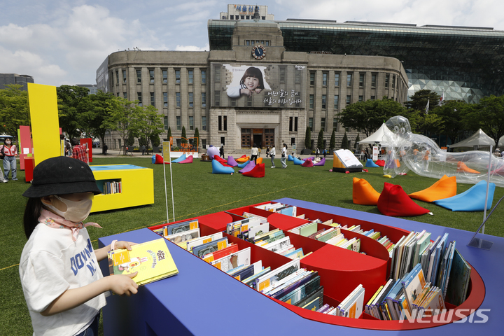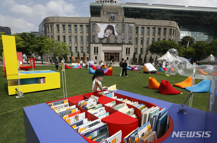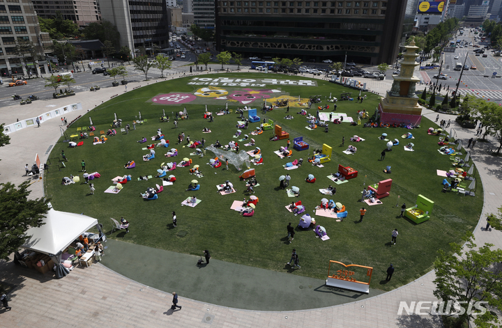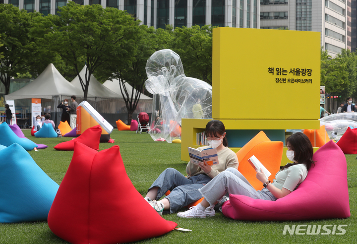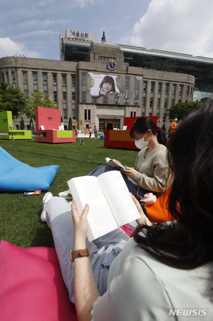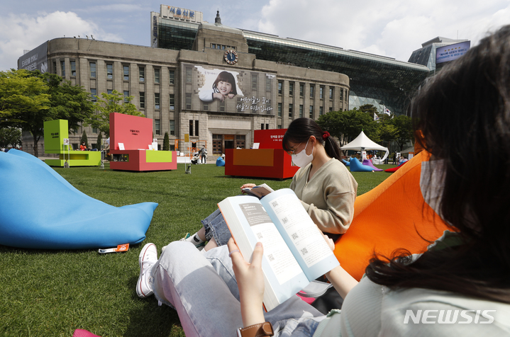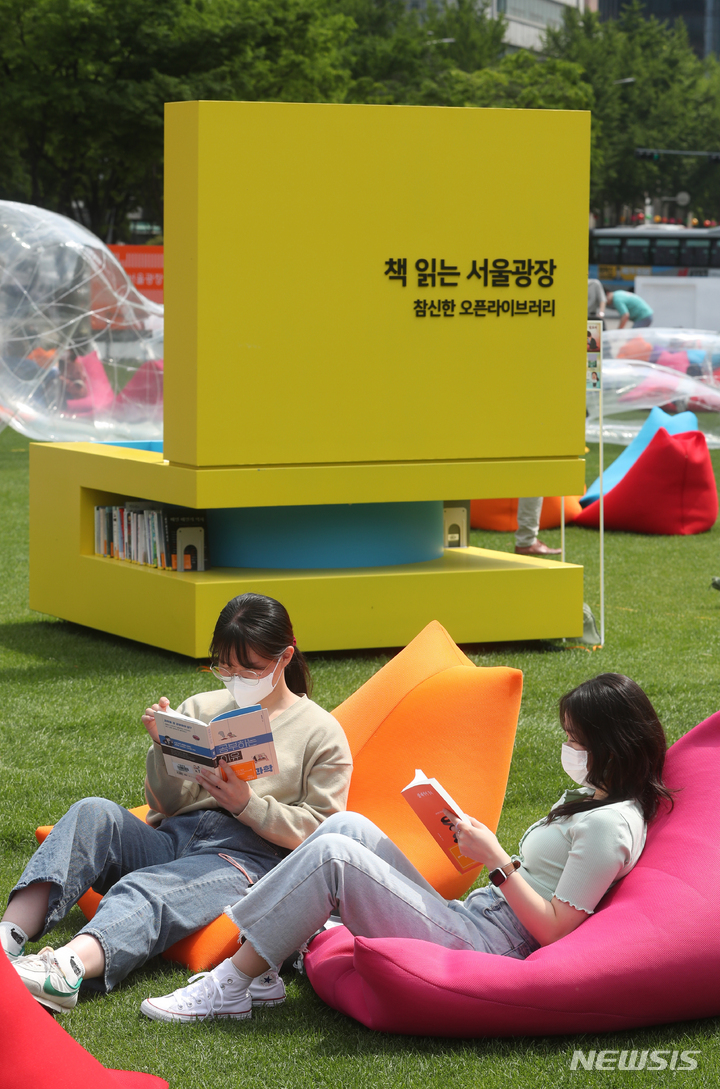 6日、ソウル広場で開催中の「本を読むソウル広場」イベントを訪れた市民が、ソファに座って本を読んでいる様子。先月23日にオープンした「本を読むソウル広場」は、10月29日まで毎週金曜、土曜に営まれる。
